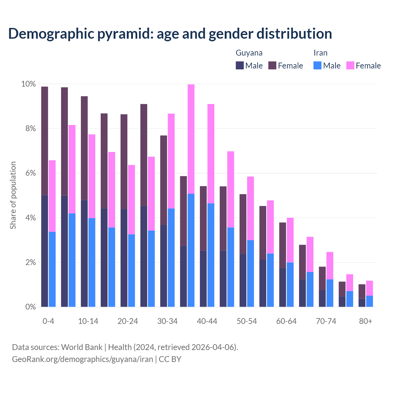 - The median age in Guyana is 26.9 years compared to 34.3 years in Iran.