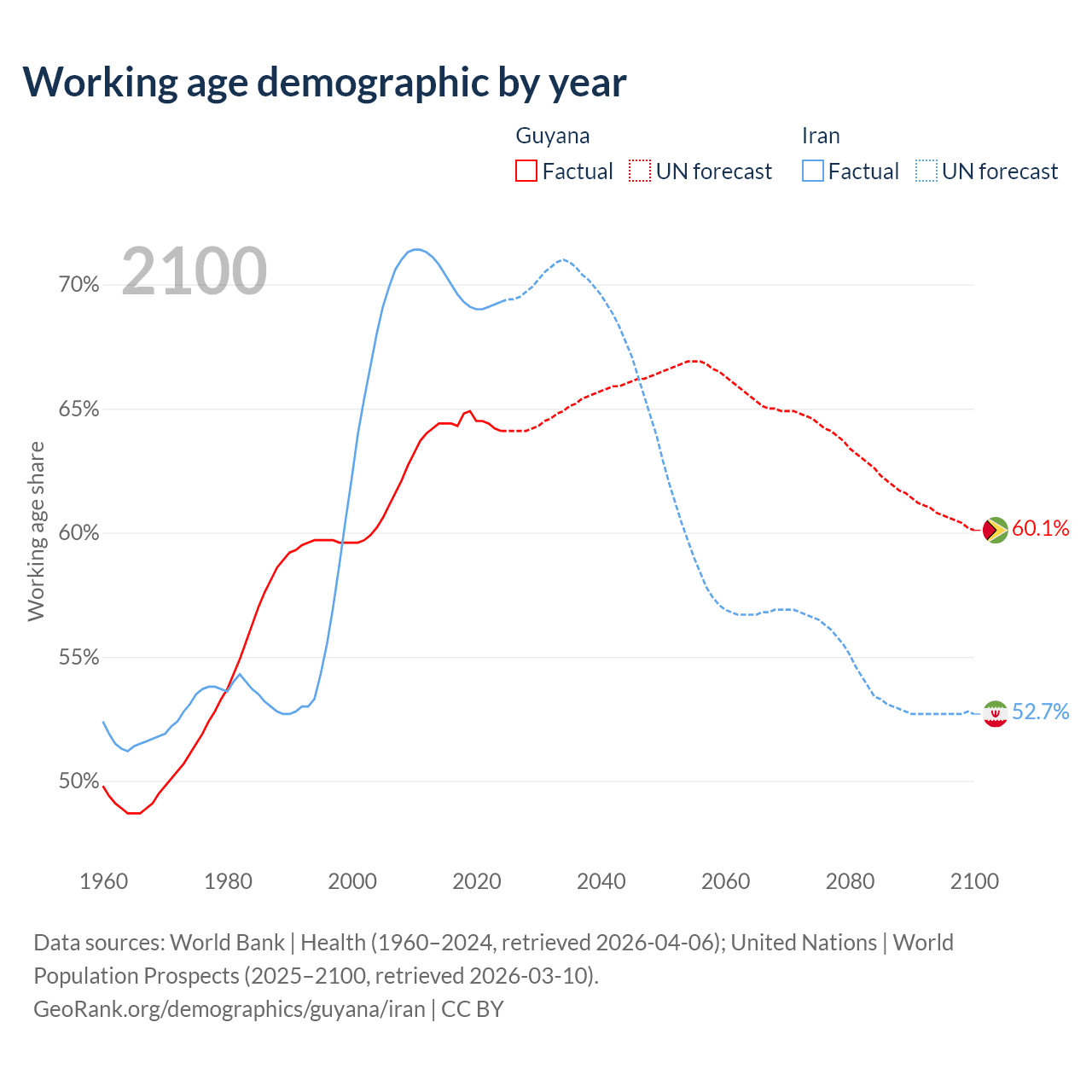 - Guyana has 540K working age adults (aged 15-64) vs 64.8M in Iran.