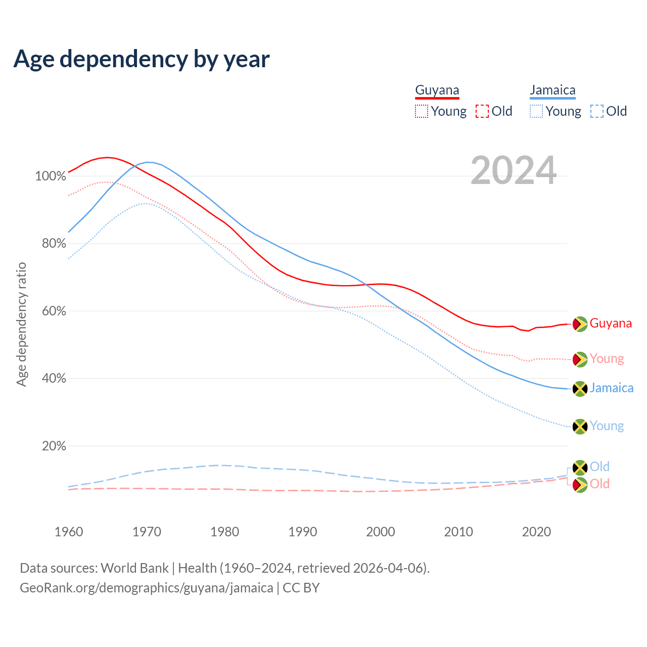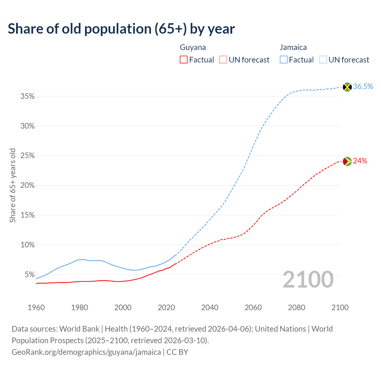 The share of older people aged 65 and over is 6.73% in Guyana and 8.21% in Jamaica. Life expectancy in Guyana compared to Jamaica .