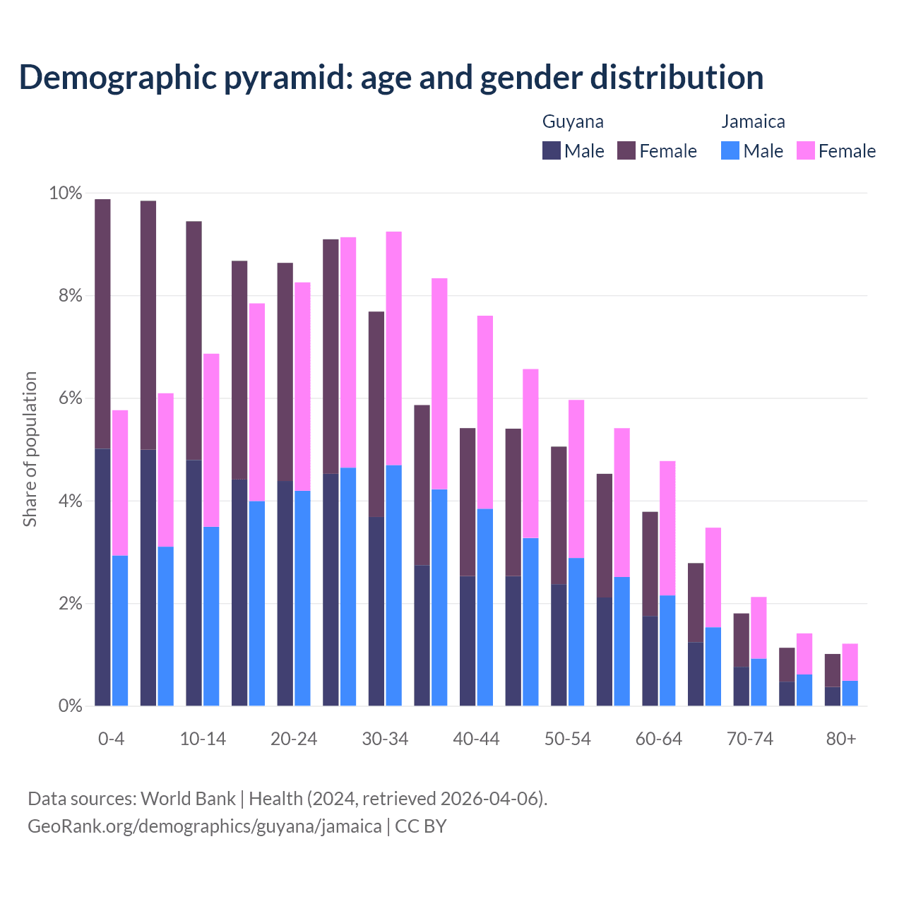 - Guyana is ranked 122/196 by median age (oldest to youngest) vs 87/196 for Jamaica.