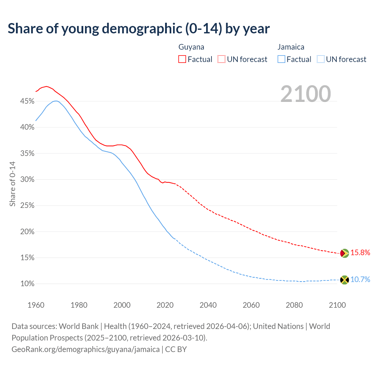 - The share of young demographic (0-15 years old) in Guyana is 29.2% vs 18.7% in Jamaica.
