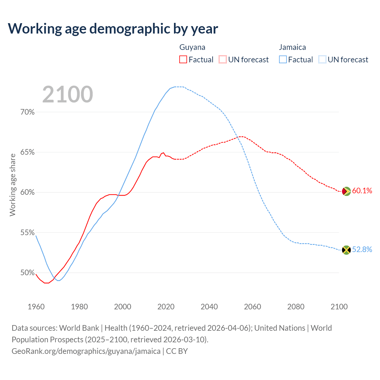- Guyana has 540K working age adults (aged 15-64) vs 2.07M in Jamaica.