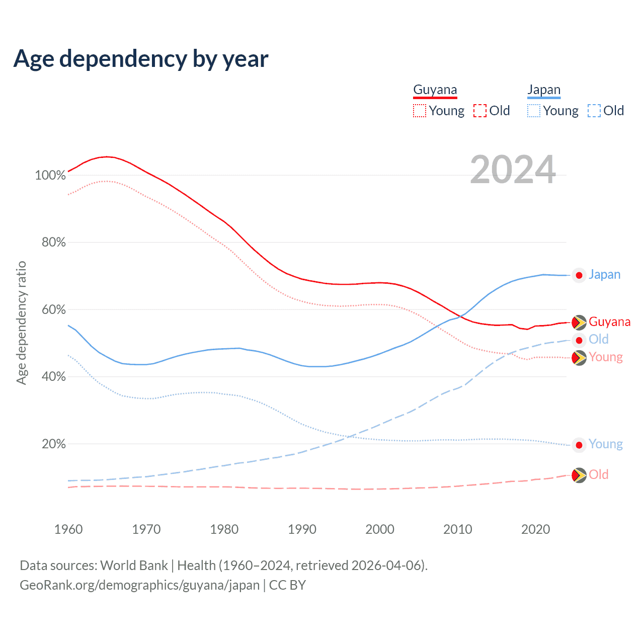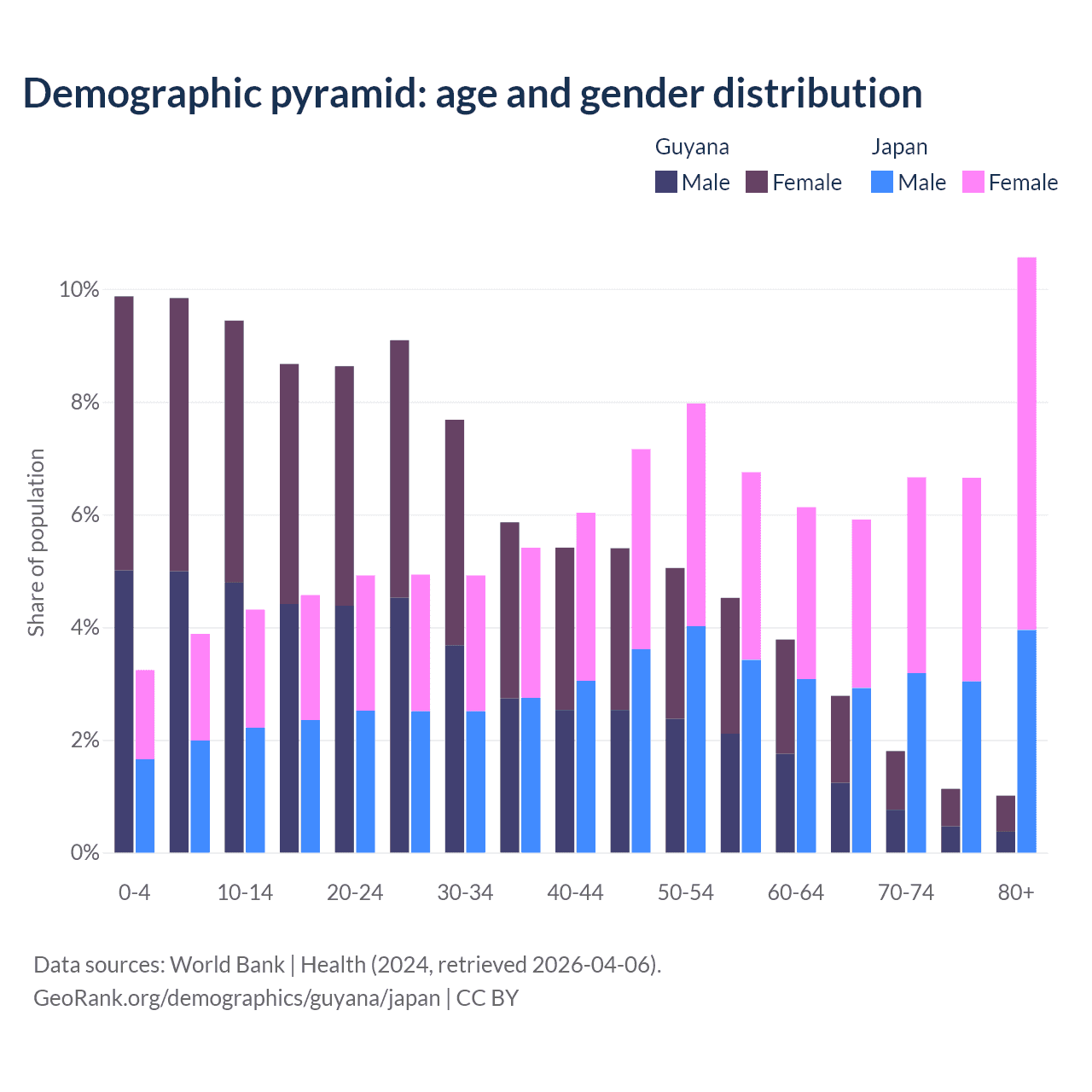 - Guyana is ranked 122/196 by median age (oldest to youngest) vs 2/196 for Japan.
