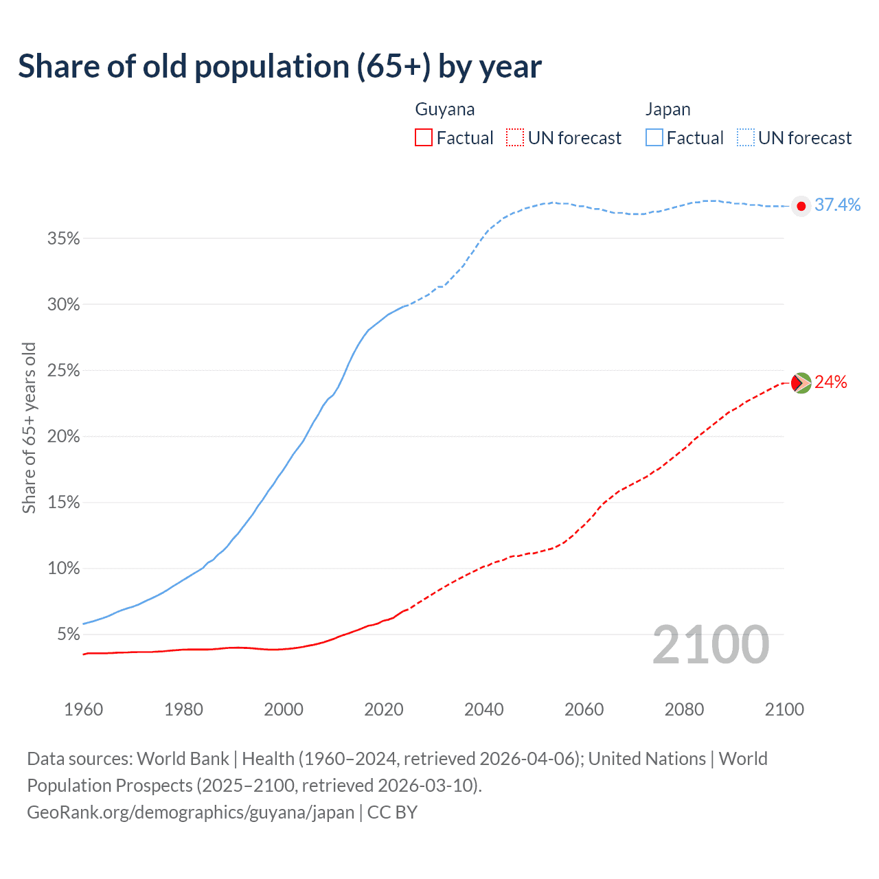 - The share of old-age demographic (65+) in Guyana is 6.73% vs 29.8% in Japan.