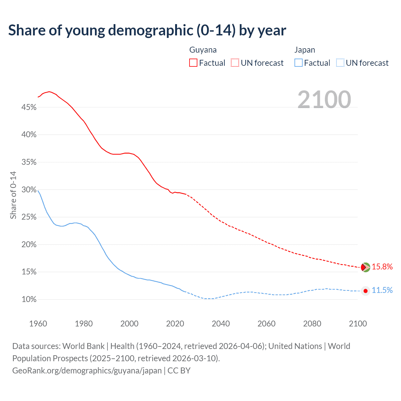 - The share of young demographic (0-15 years old) in Guyana is 29.2% vs 11.4% in Japan.