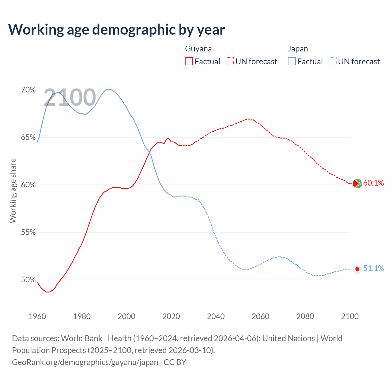 - Guyana has 540K working age adults (aged 15-64) vs 72.1M in Japan.