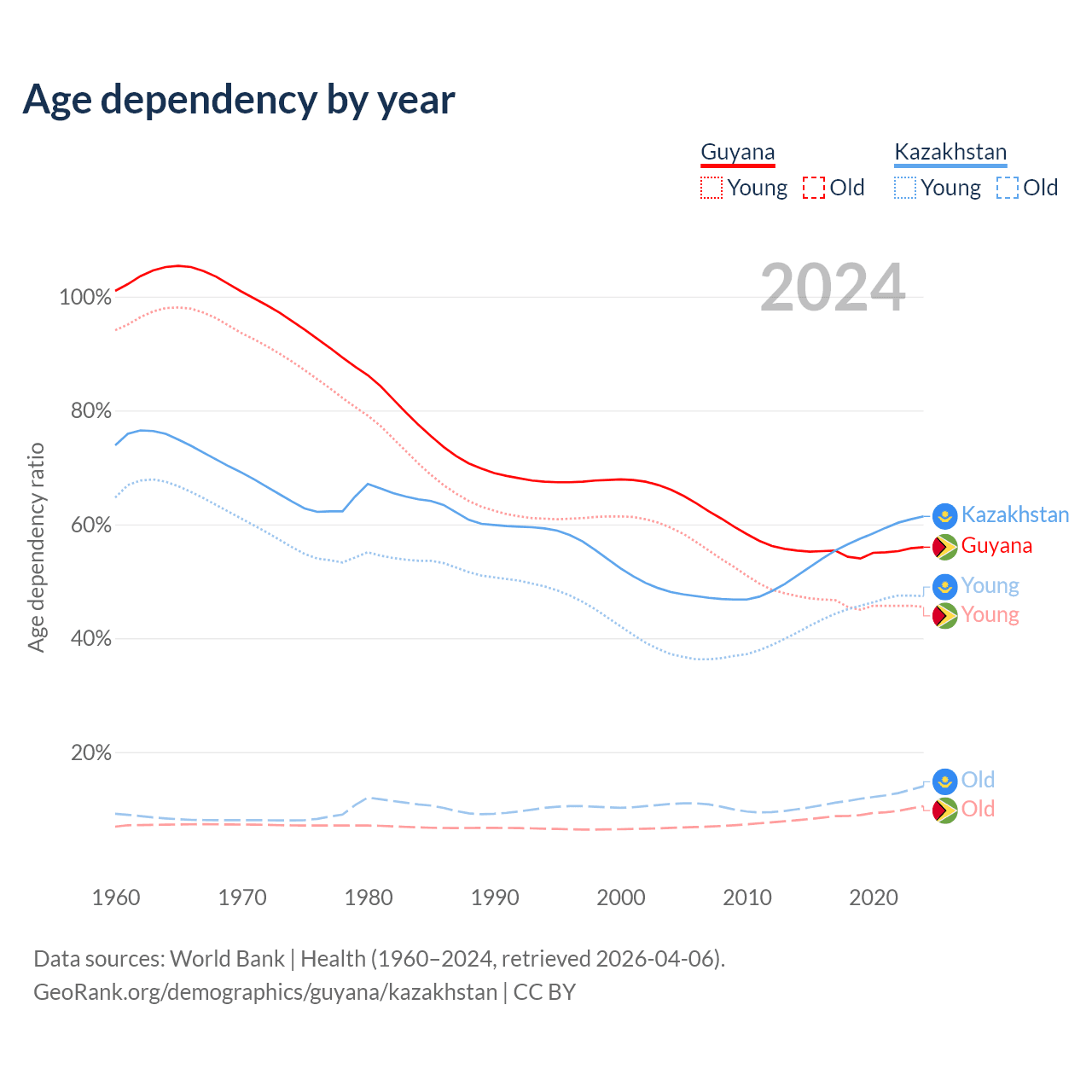 - The share of young demographic (0-15 years old) in Guyana is 29.2% vs 29.4% in Kazakhstan.