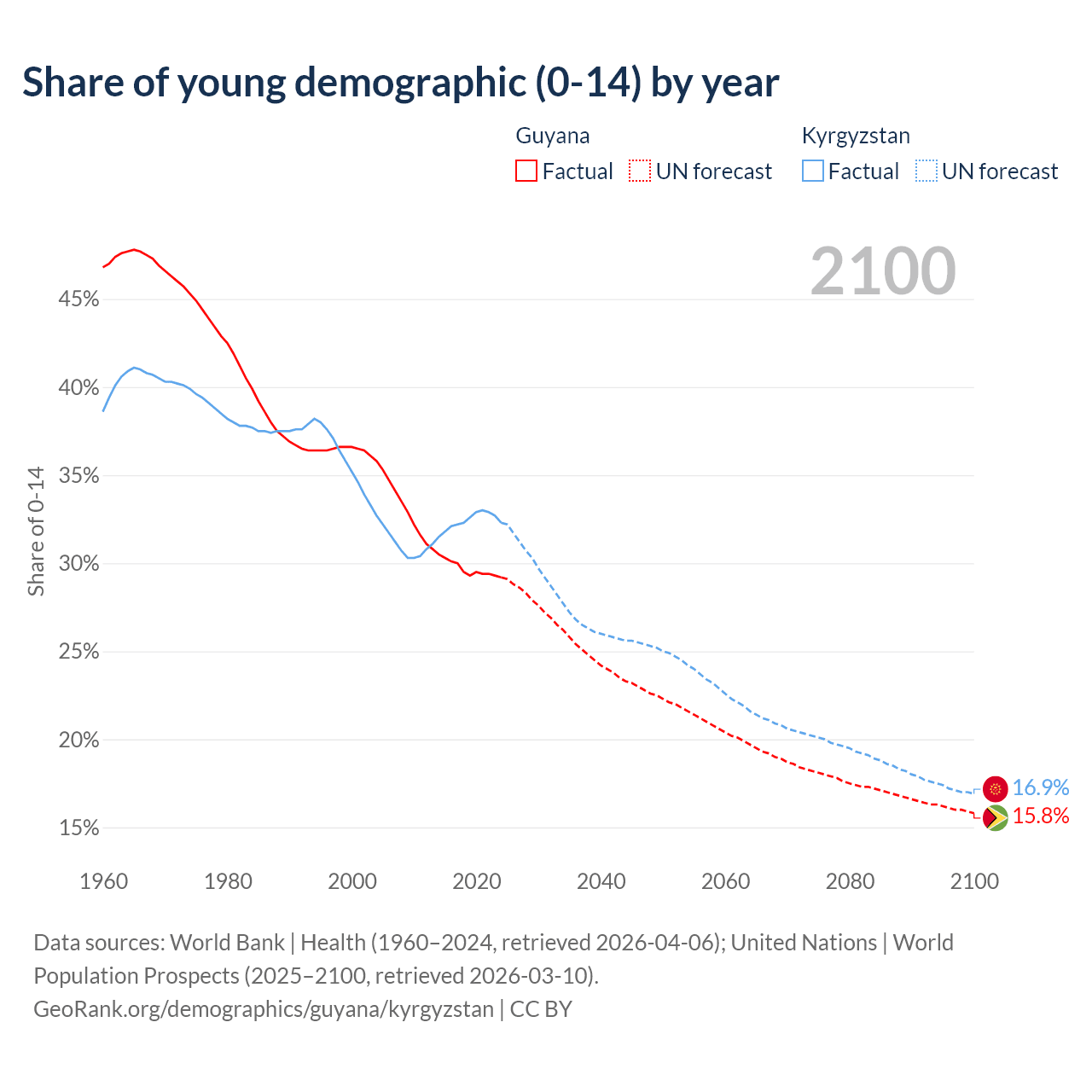 - The share of young demographic (0-15 years old) in Guyana is 29.2% vs 32.3% in Kyrgyzstan.