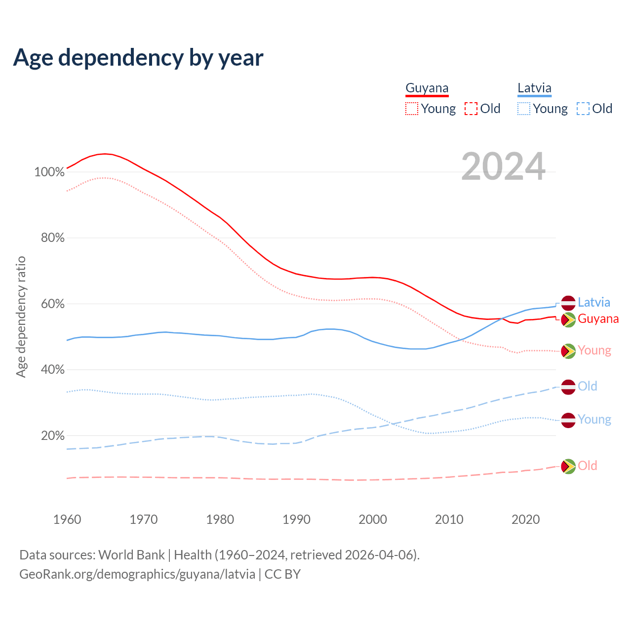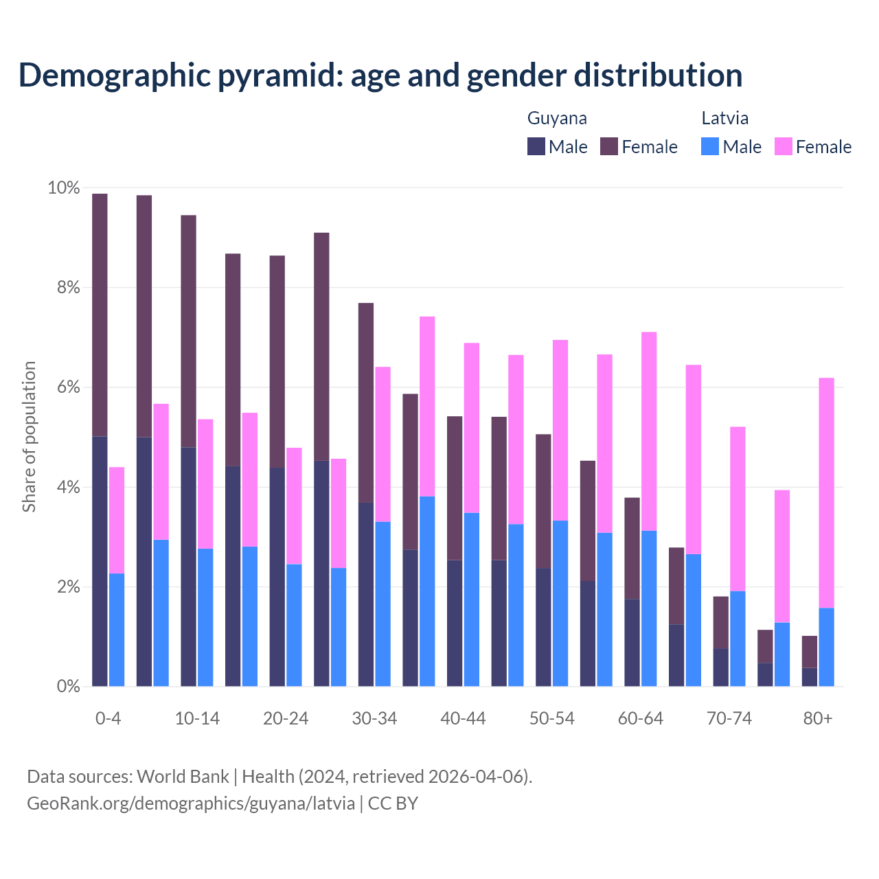 - Guyana is ranked 122/196 by median age (oldest to youngest) vs 20/196 for Latvia.