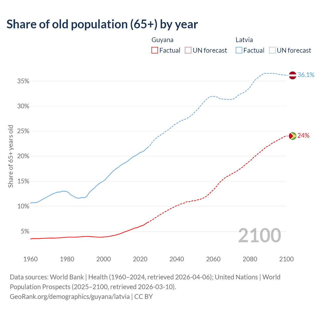 - The share of old-age demographic (65+) in Guyana is 6.73% vs 21.7% in Latvia.
