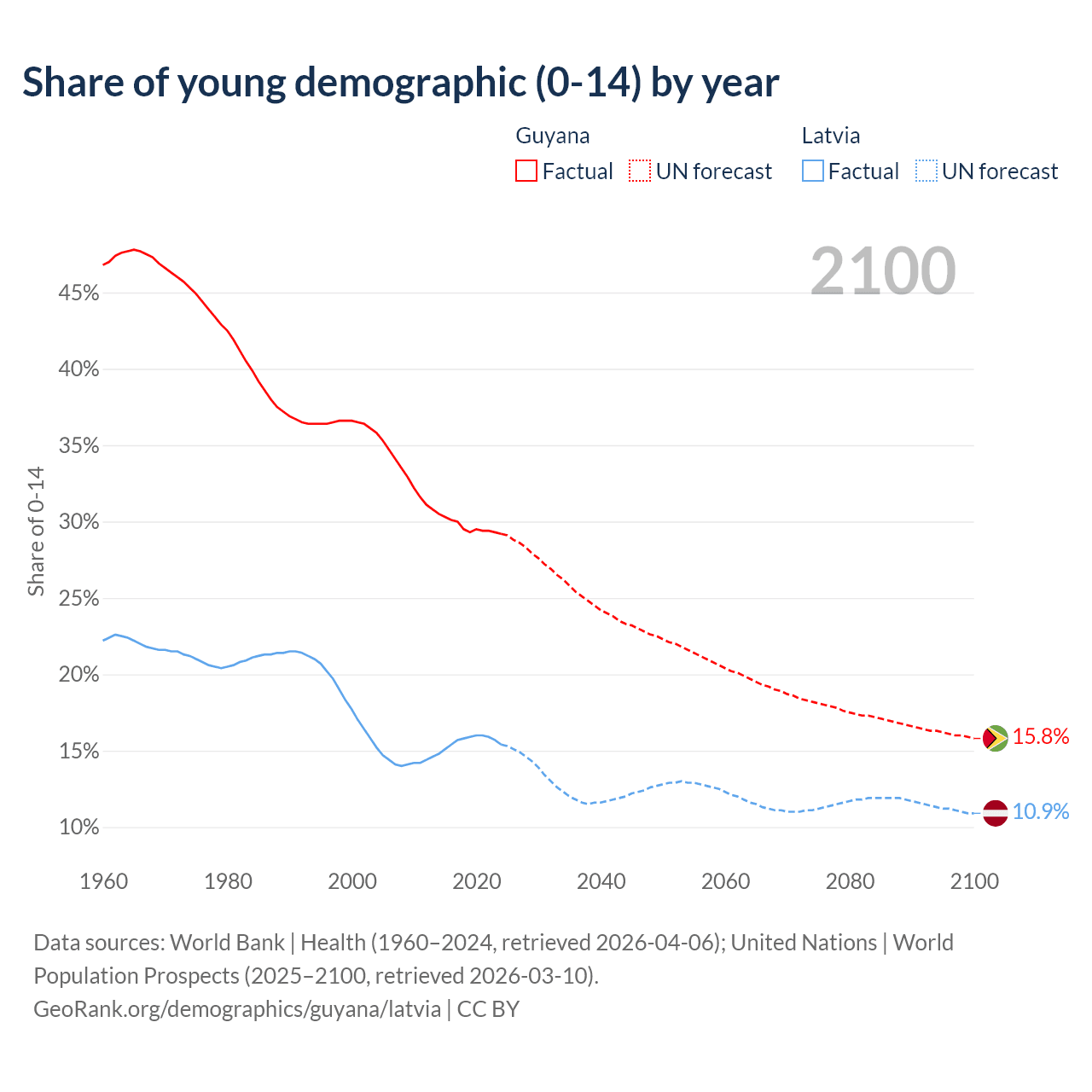 - The share of young demographic (0-15 years old) in Guyana is 29.2% vs 15.4% in Latvia.