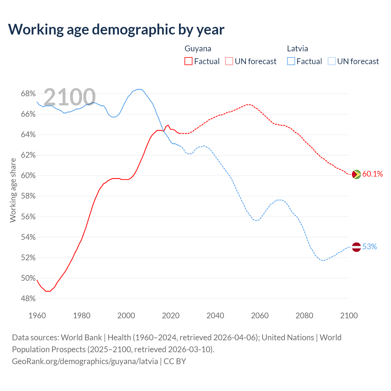 - Guyana has 540K working age adults (aged 15-64) vs 1.15M in Latvia.