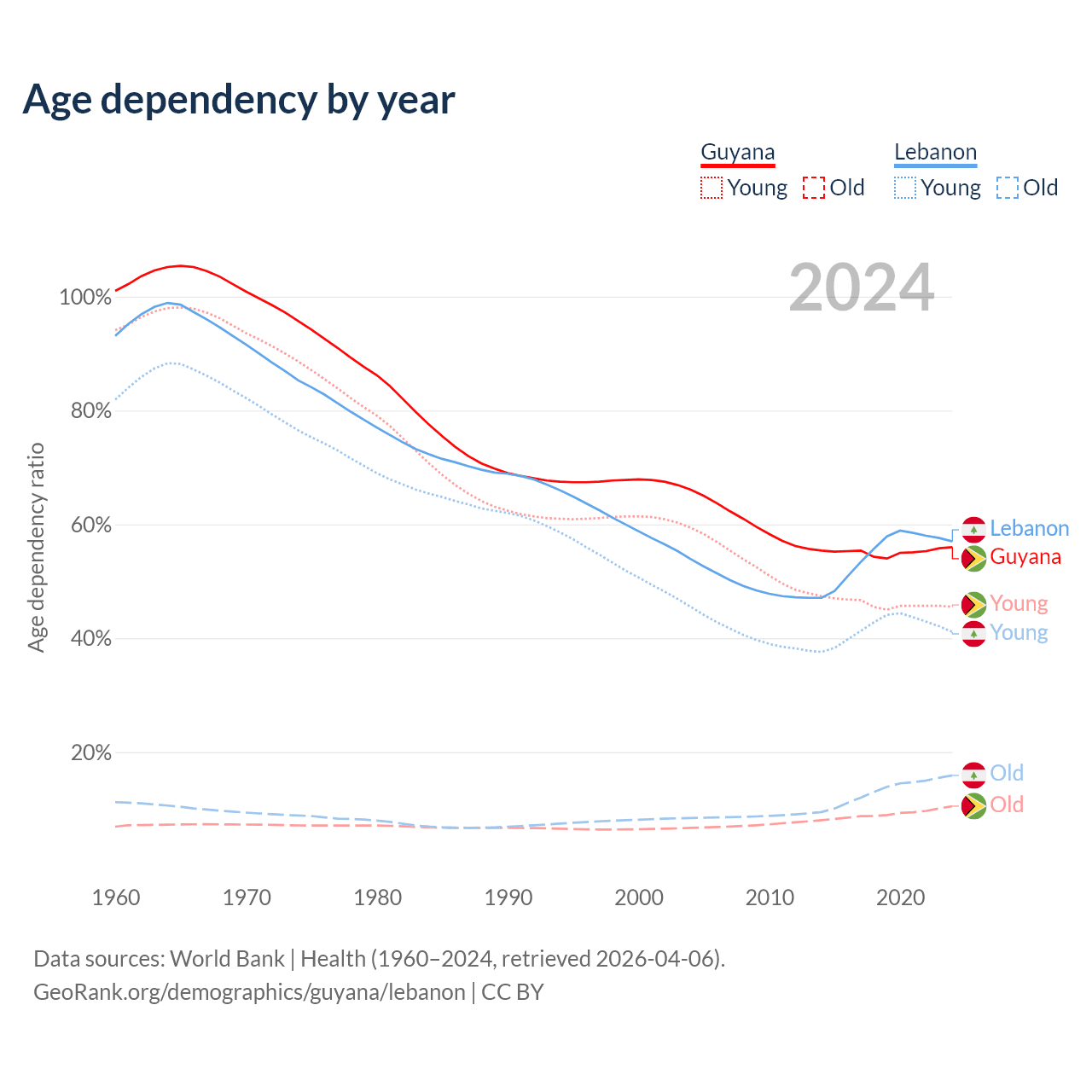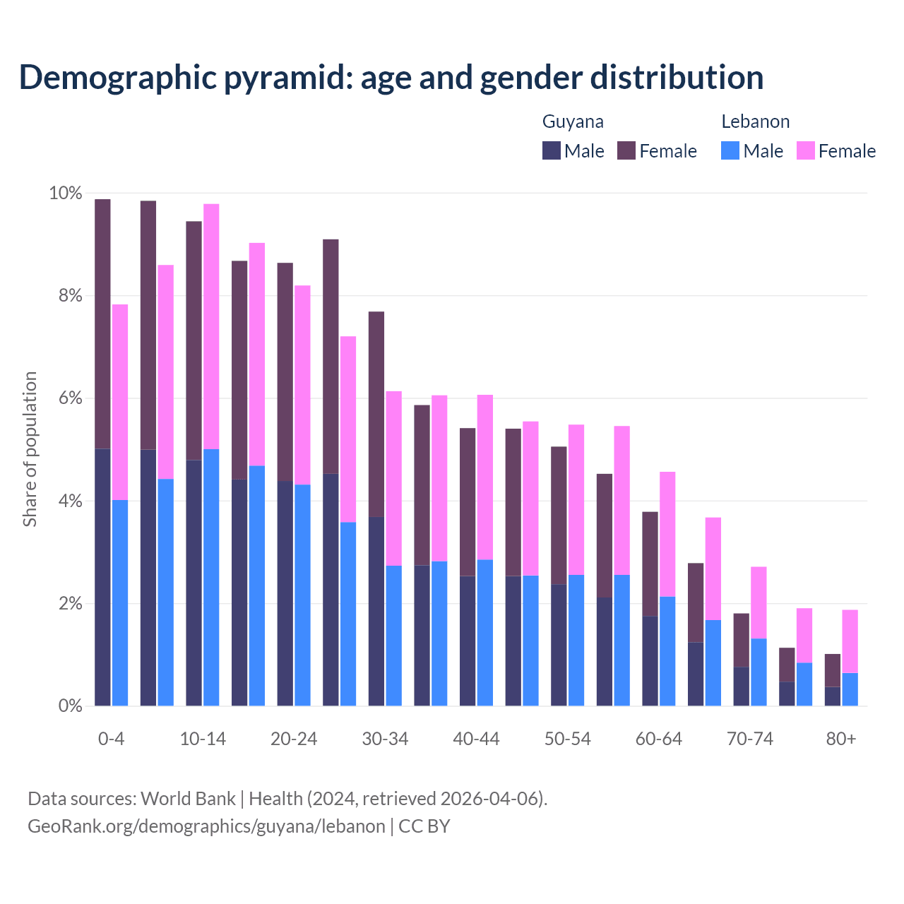 - Guyana is ranked 122/196 by median age (oldest to youngest) vs 106/196 for Lebanon.