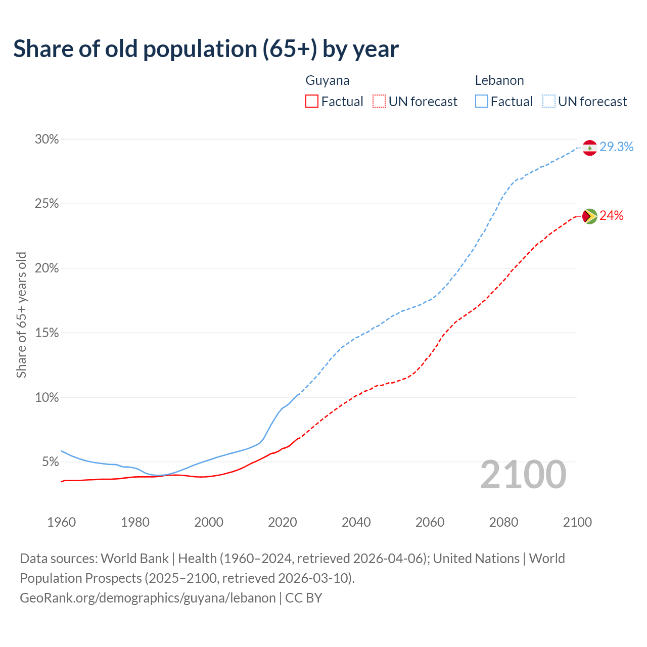 The share of older people aged 65 and over is 6.73% in Guyana and 10.1% in Lebanon. Life expectancy in Guyana compared to Lebanon .