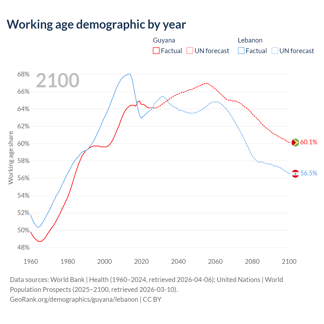 - Guyana has 540K working age adults (aged 15-64) vs 3.76M in Lebanon.