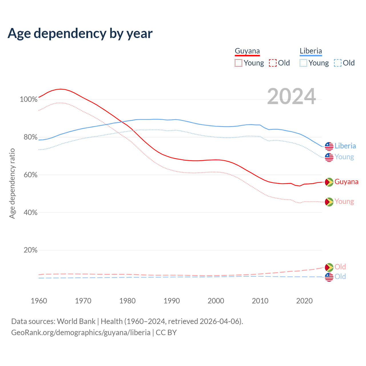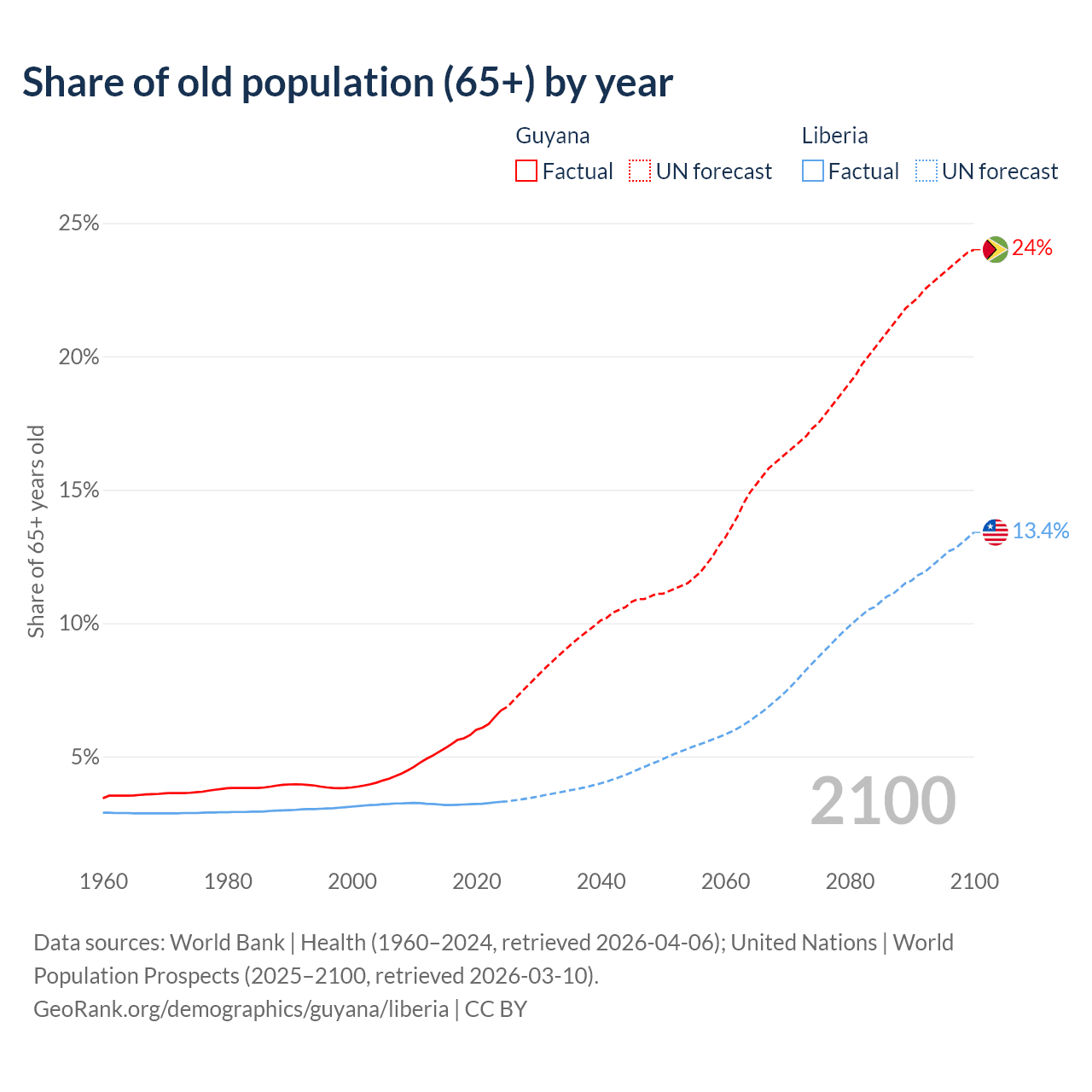 - The share of old-age demographic (65+) in Guyana is 6.73% vs 3.3% in Liberia.