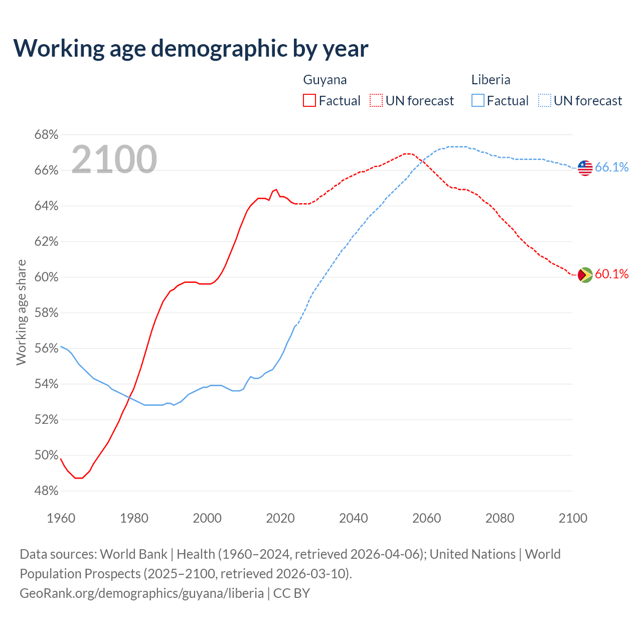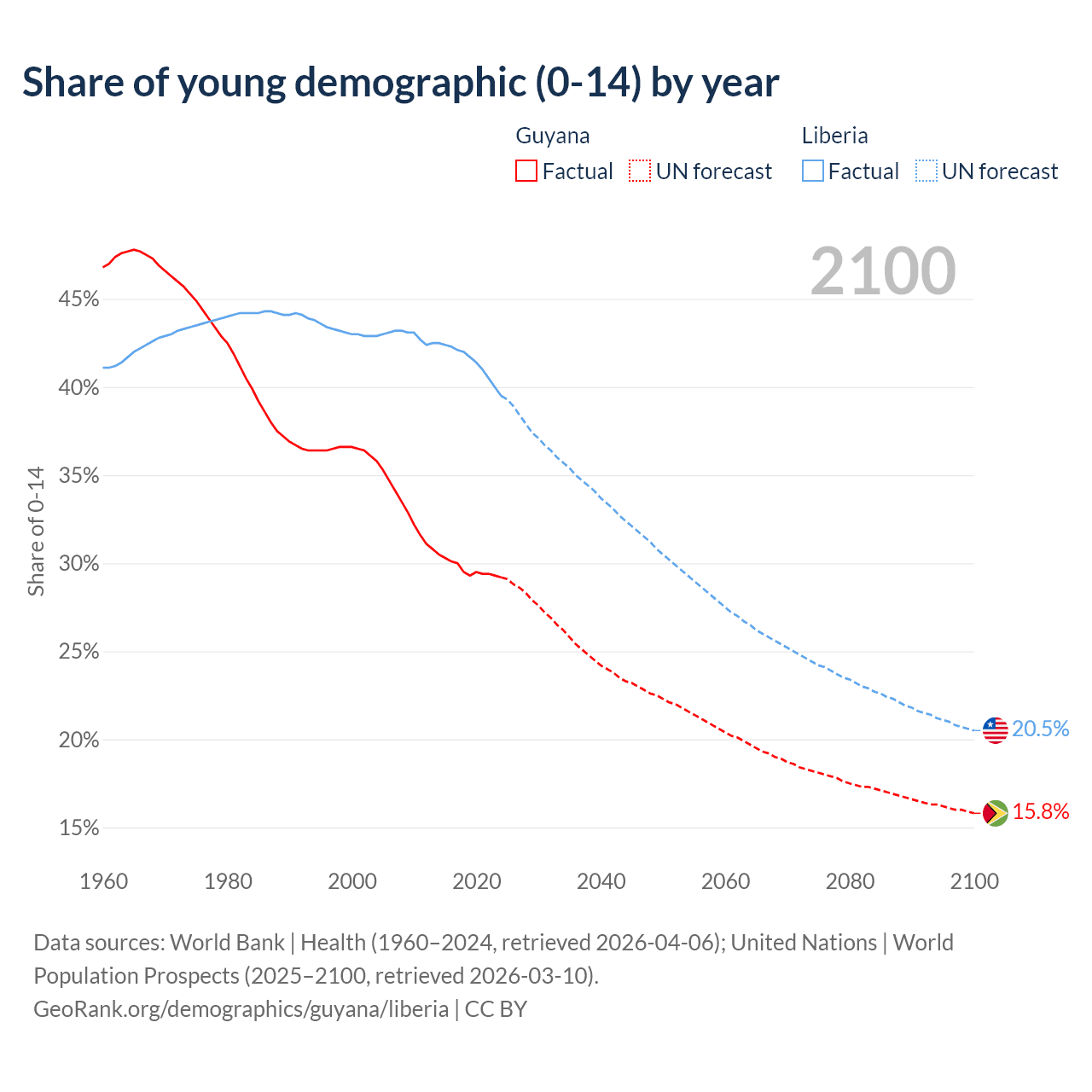 Median age Guyana vs Liberia, 1960-2100