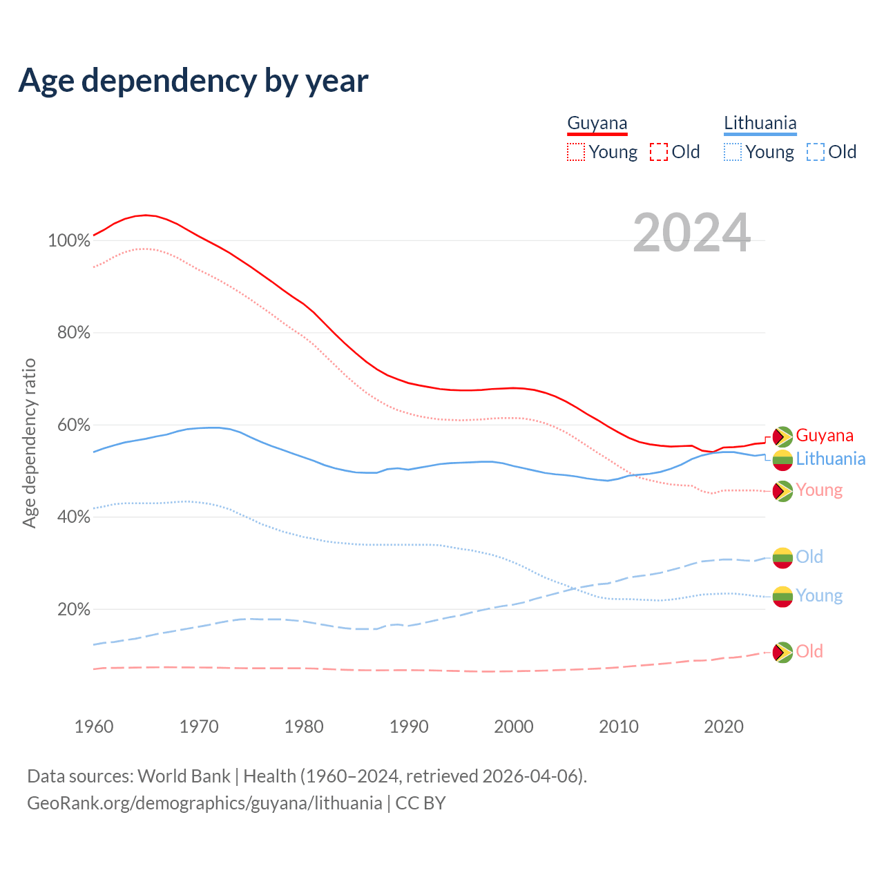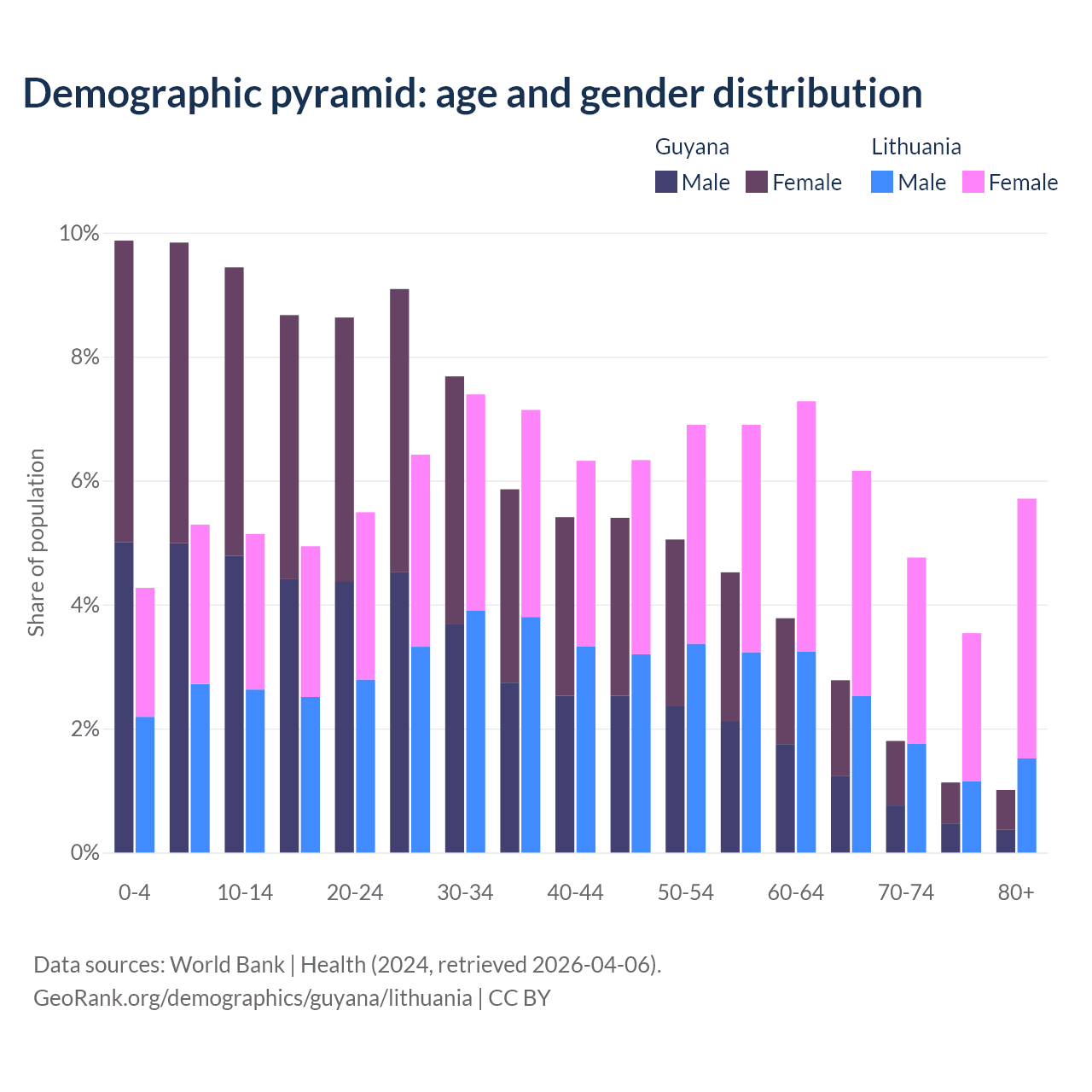 - The share of old-age demographic (65+) in Guyana is 6.73% vs 20.2% in Lithuania.