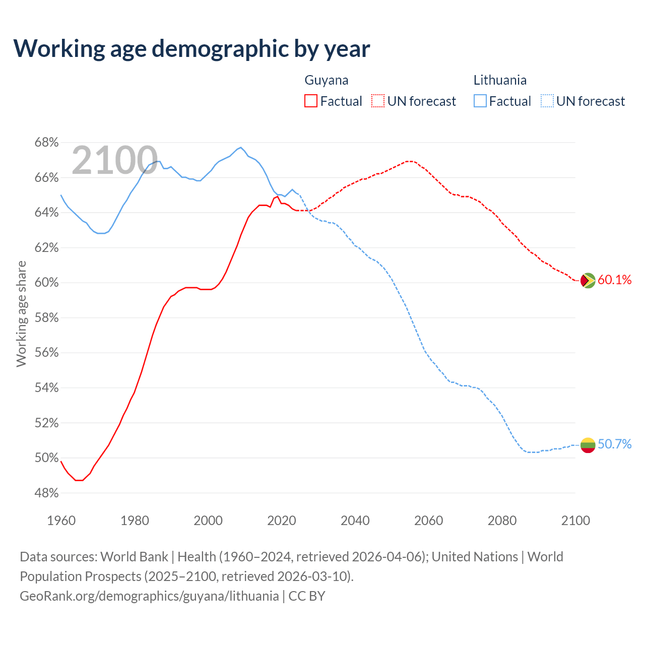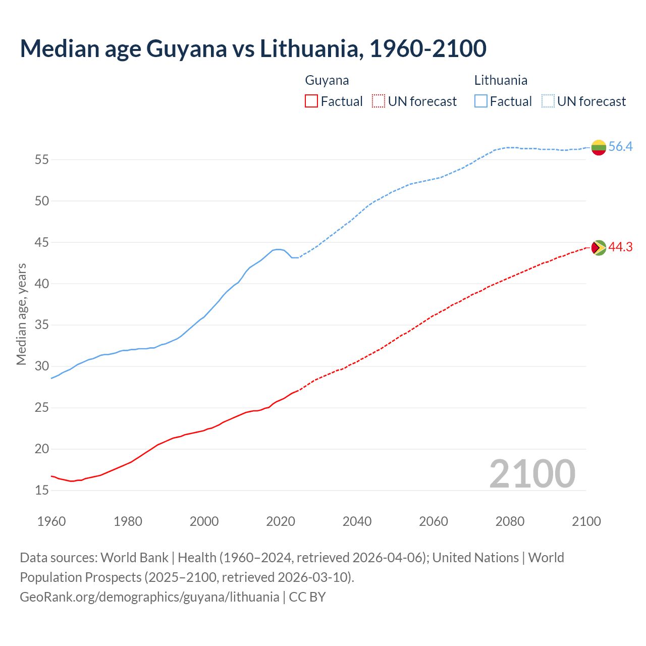 Median age Guyana vs Lithuania, 1960-2100