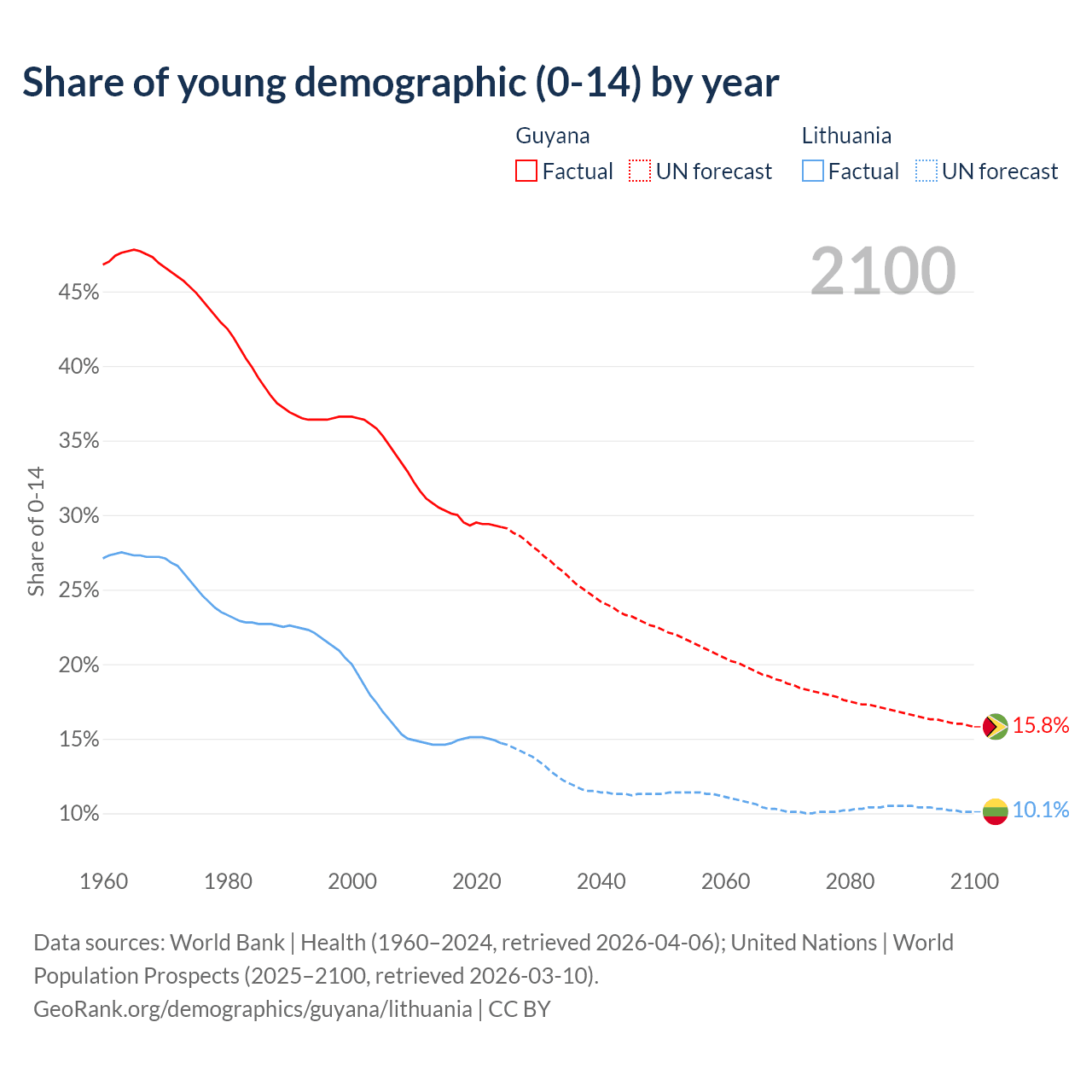 - The share of young demographic (0-15 years old) in Guyana is 29.2% vs 14.7% in Lithuania.