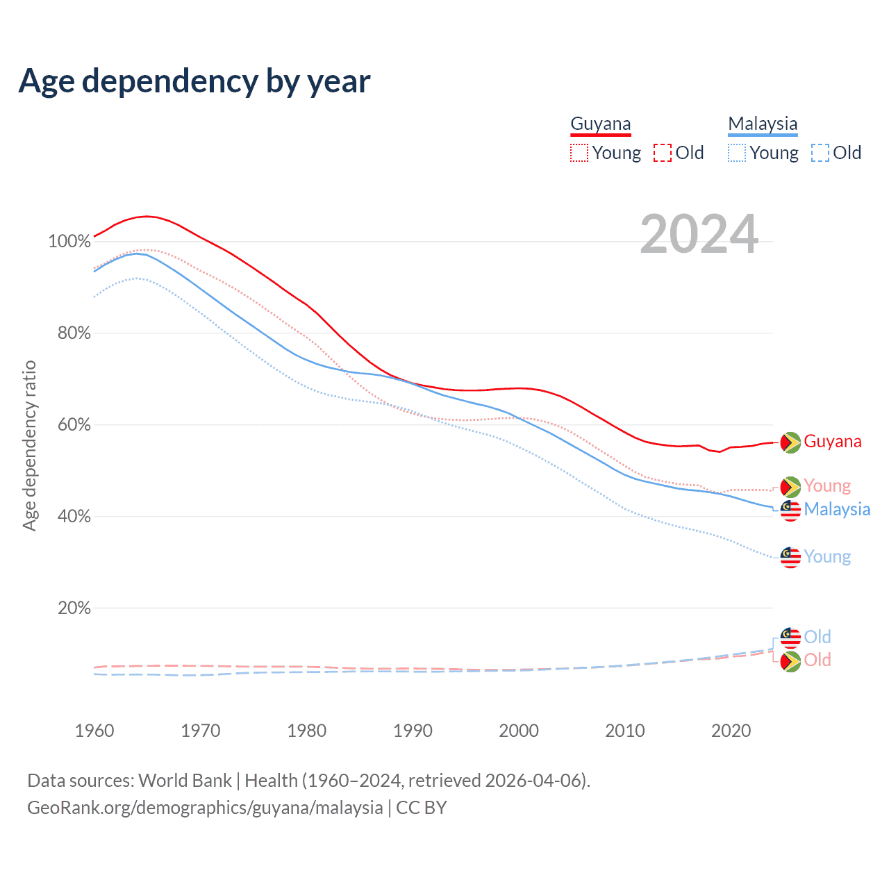 The share of older people aged 65 and over is 6.73% in Guyana and 7.74% in Malaysia. Life expectancy in Guyana compared to Malaysia .
