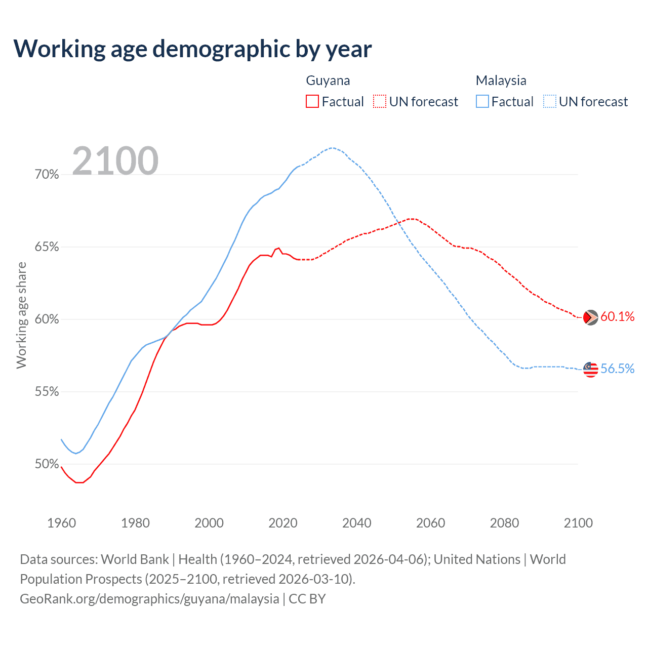 Median age Guyana vs Malaysia, 1960-2100