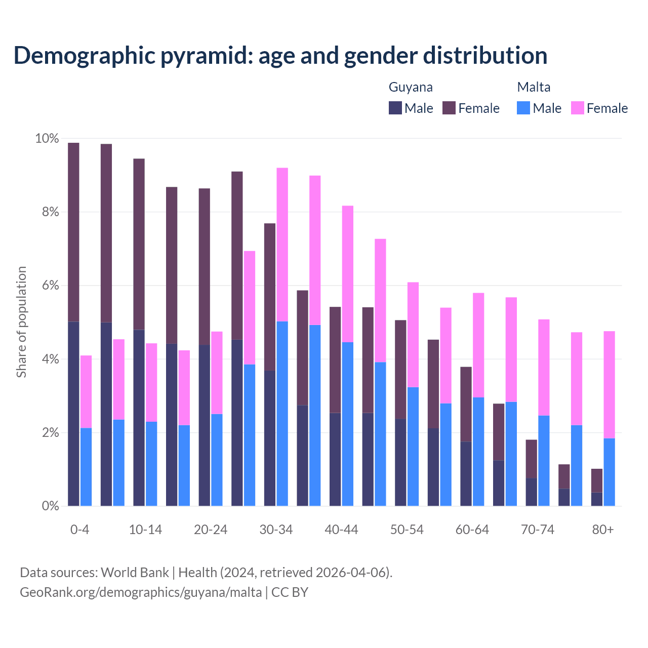 - The share of old-age demographic (65+) in Guyana is 6.73% vs 20.2% in Malta.
