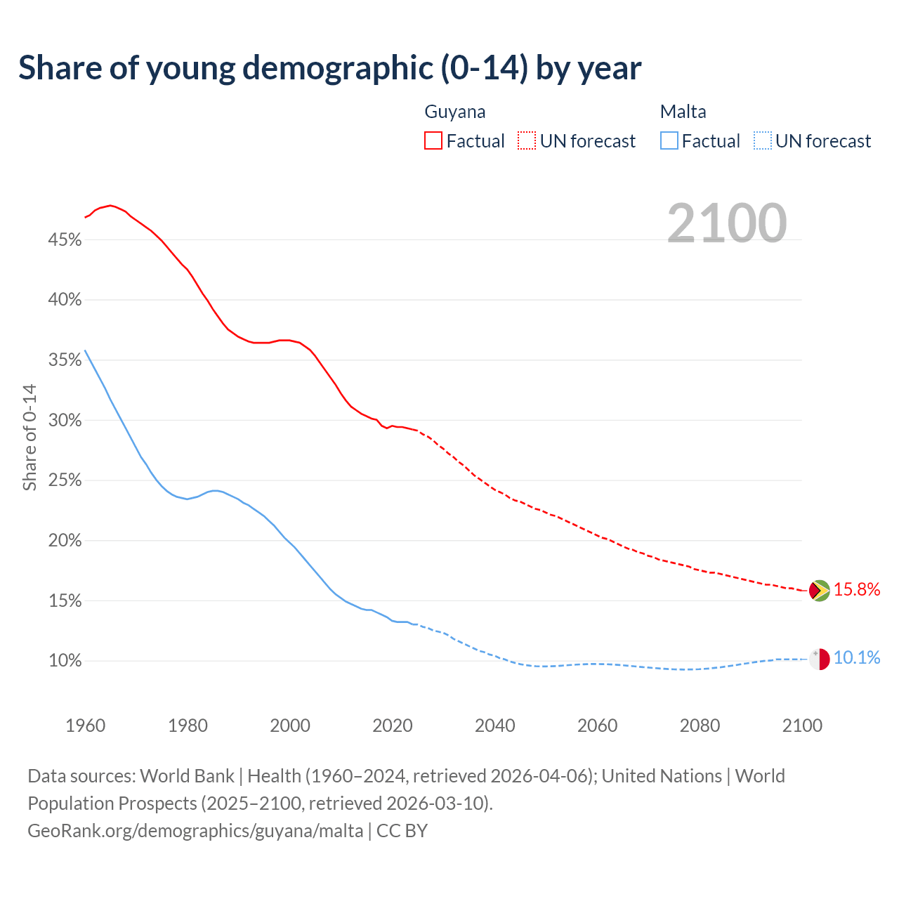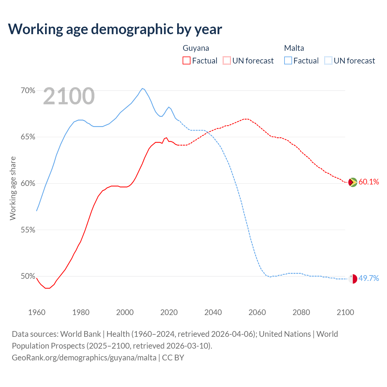 Median age Guyana vs Malta, 1960-2100
