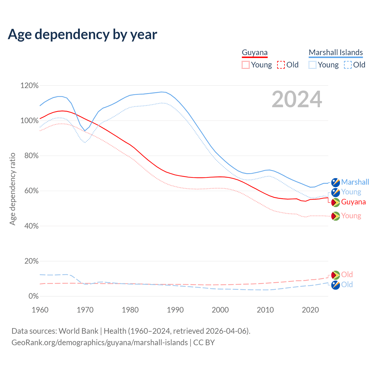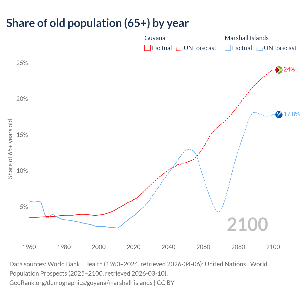 - The share of old-age demographic (65+) in Guyana is 6.73% vs 4.64% in the Marshall Islands.