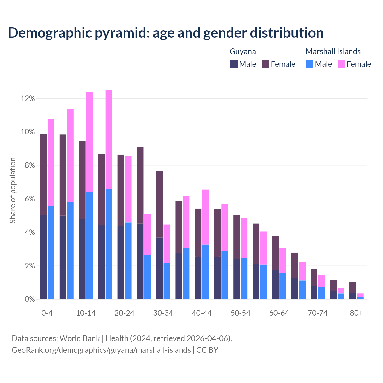 - As of 2026, the population of Guyana is 842K vs 35.1K in the Marshall Islands - 24 times difference.