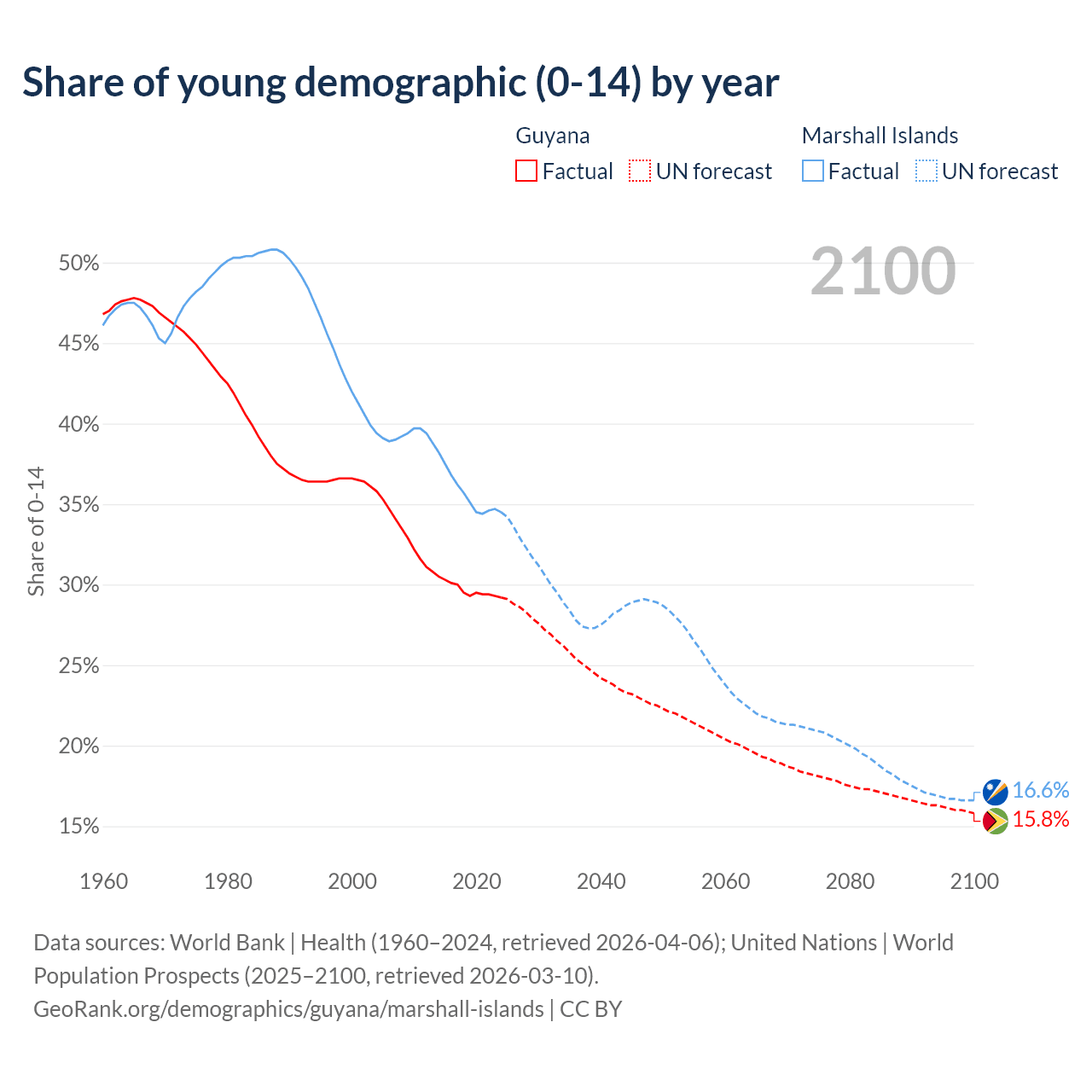 - The share of young demographic (0-15 years old) in Guyana is 29.2% vs 34.5% in the Marshall Islands.