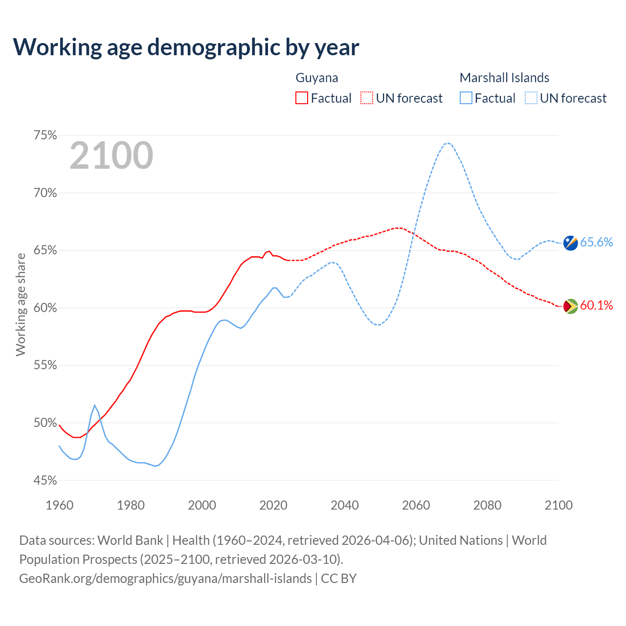 - Guyana has 540K working age adults (aged 15-64) vs 21.3K in the Marshall Islands.