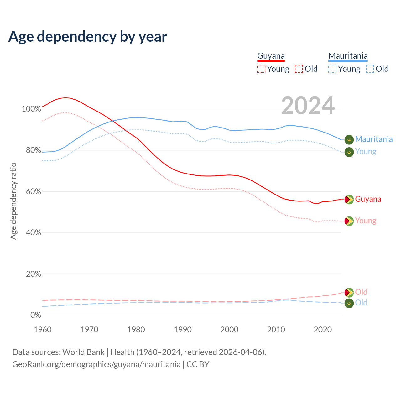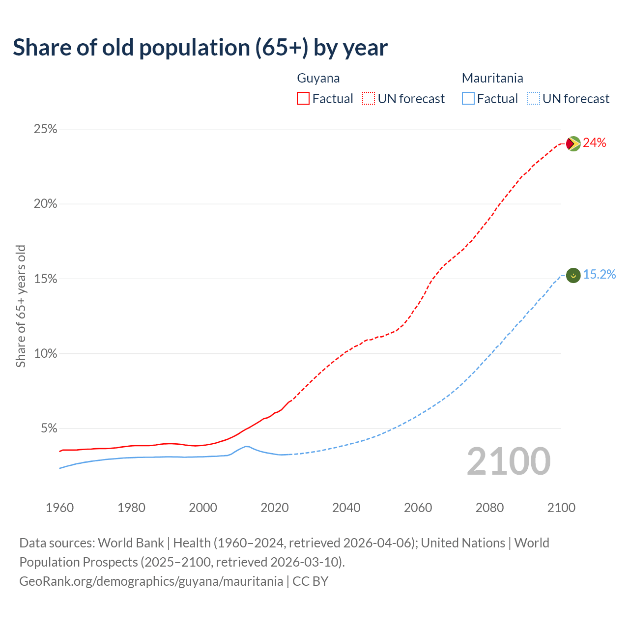 - The share of old-age demographic (65+) in Guyana is 6.73% vs 3.23% in Mauritania.