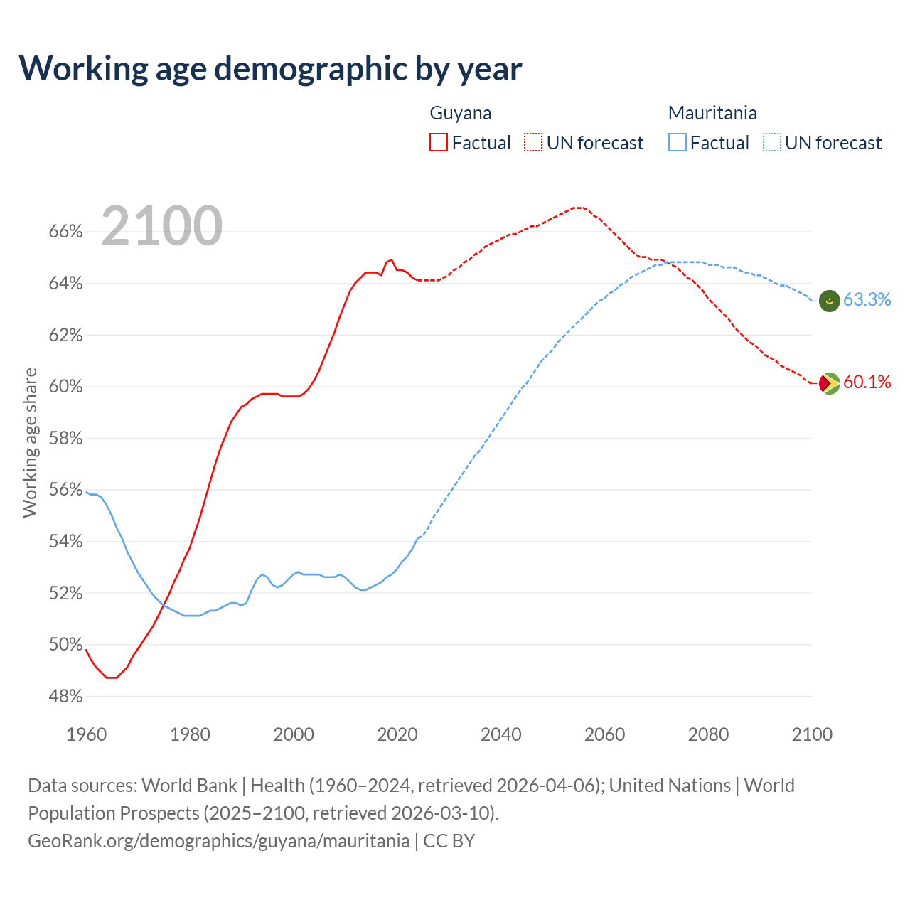 Median age Guyana vs Mauritania, 1960-2100