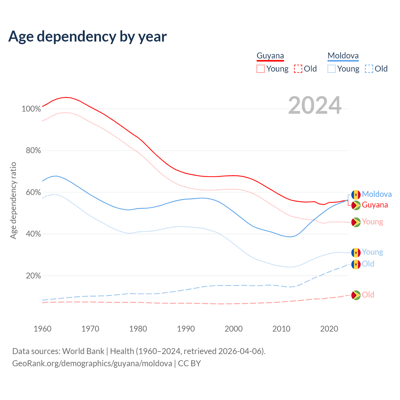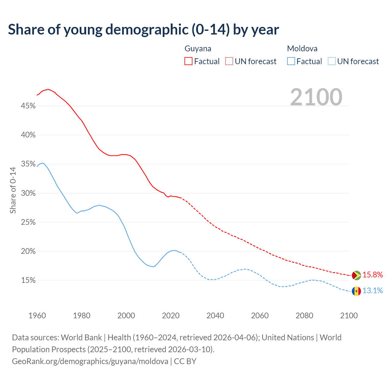 - The share of young demographic (0-15 years old) in Guyana is 29.2% vs 19.8% in Moldova.