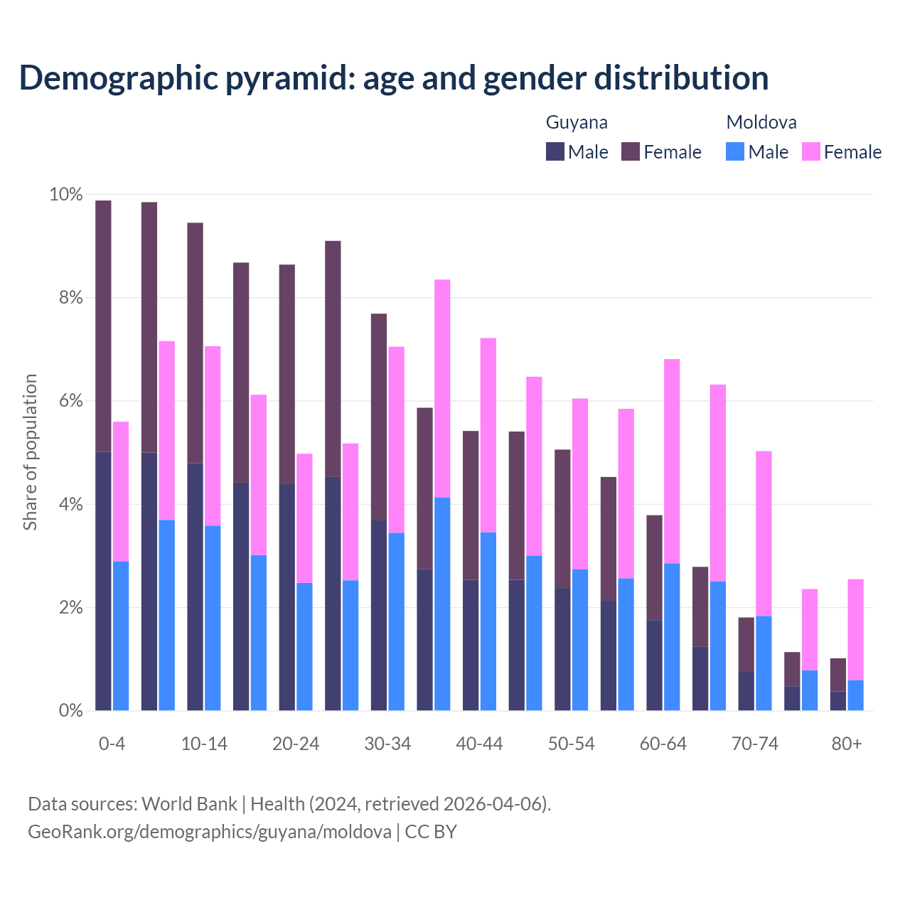 - The share of old-age demographic (65+) in Guyana is 6.73% vs 16.2% in Moldova.