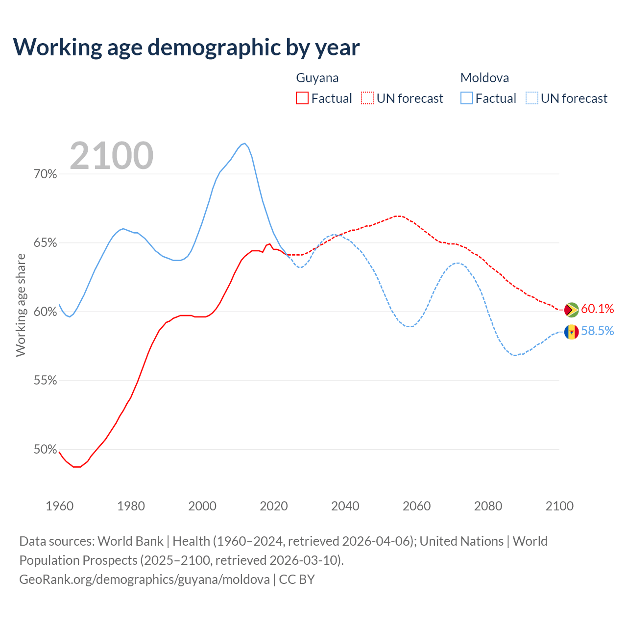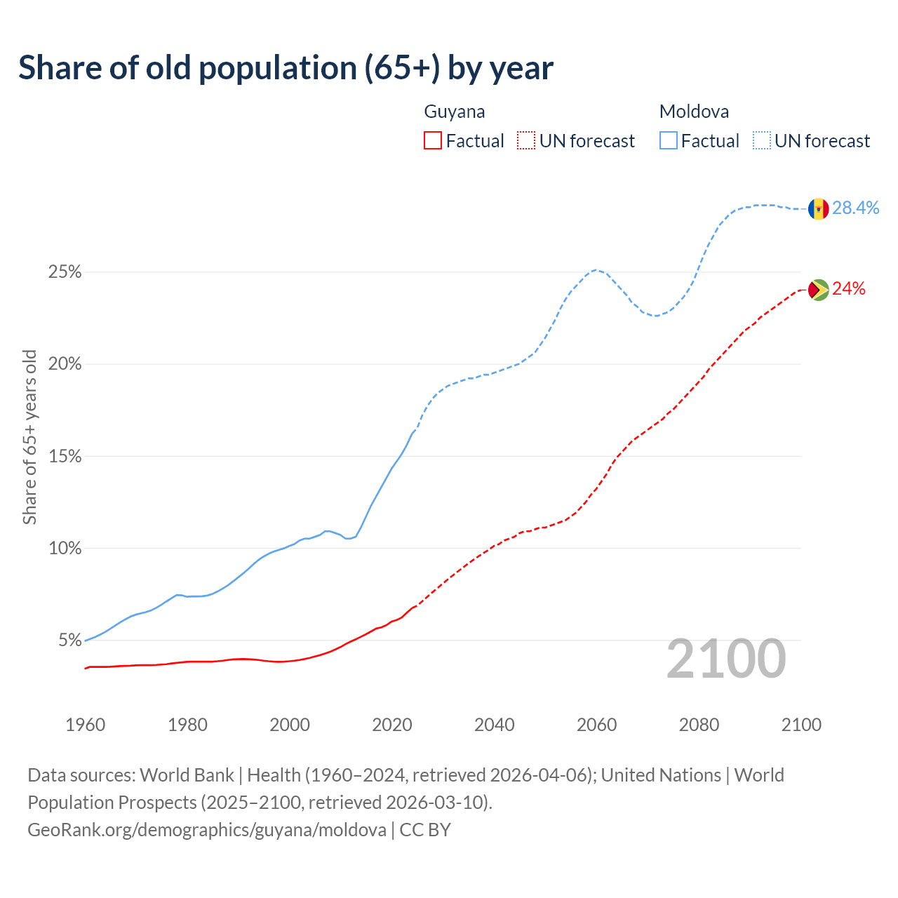 Median age Guyana vs Moldova, 1960-2100