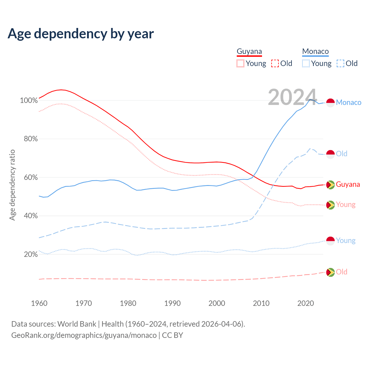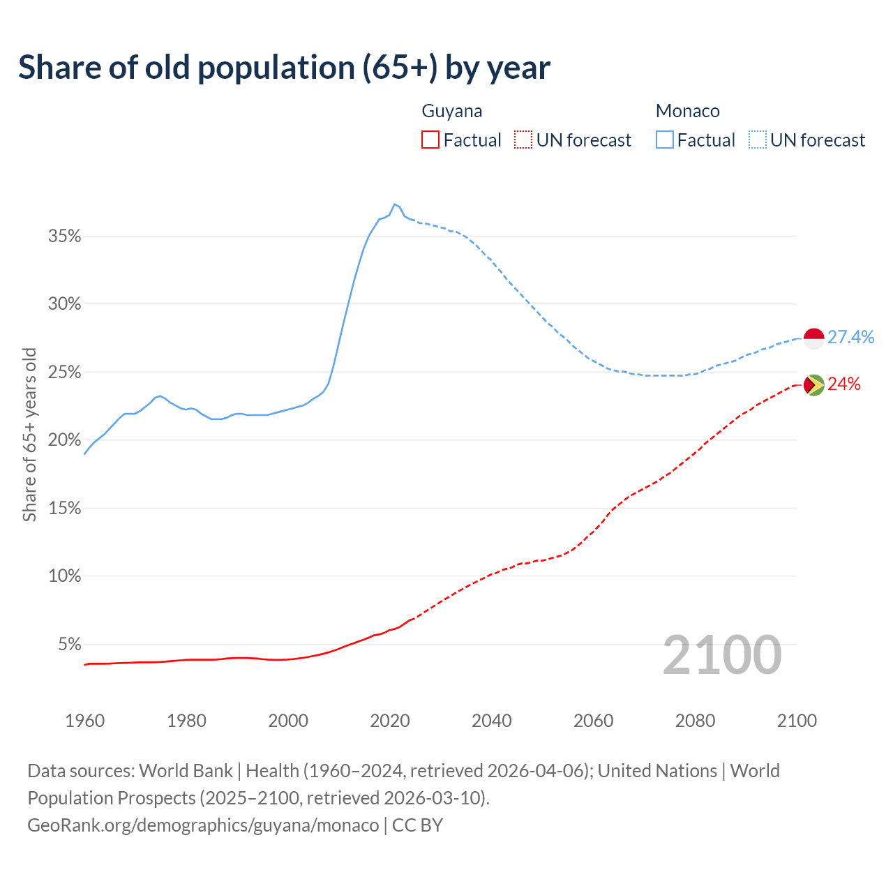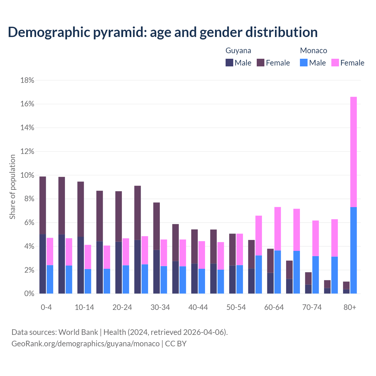 - The share of old-age demographic (65+) in Guyana is 6.73% vs 36.2% in Monaco.