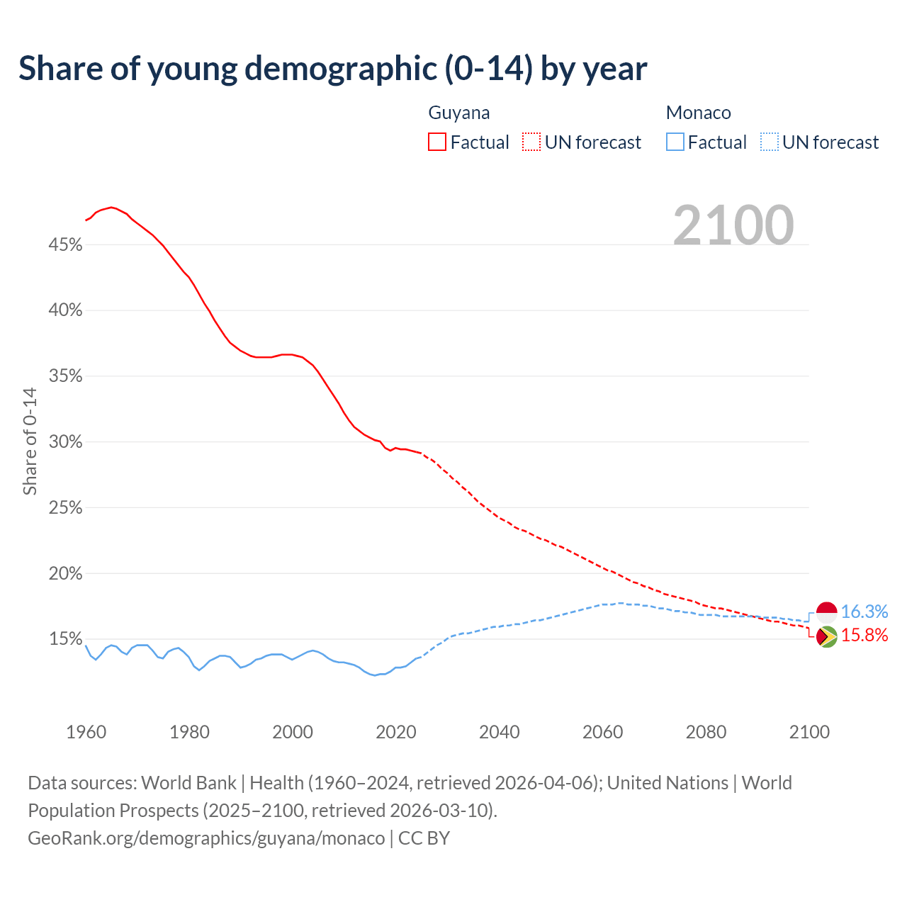 - The share of young demographic (0-15 years old) in Guyana is 29.2% vs 13.5% in Monaco.