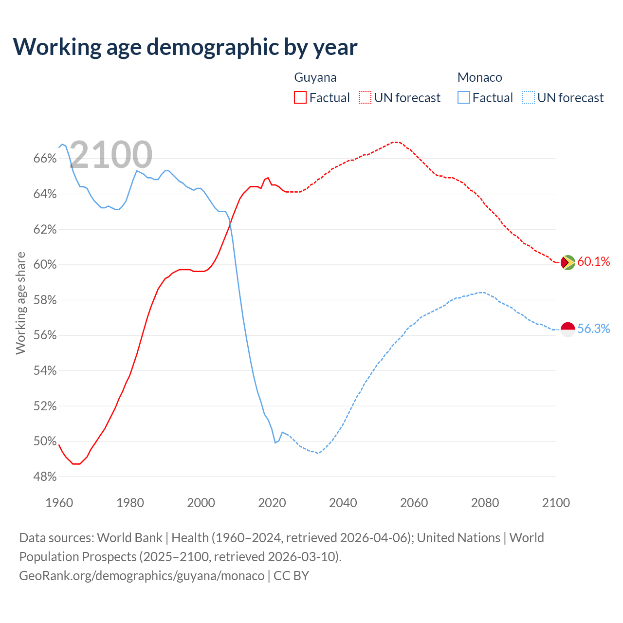 Median age Guyana vs Monaco, 1960-2100
