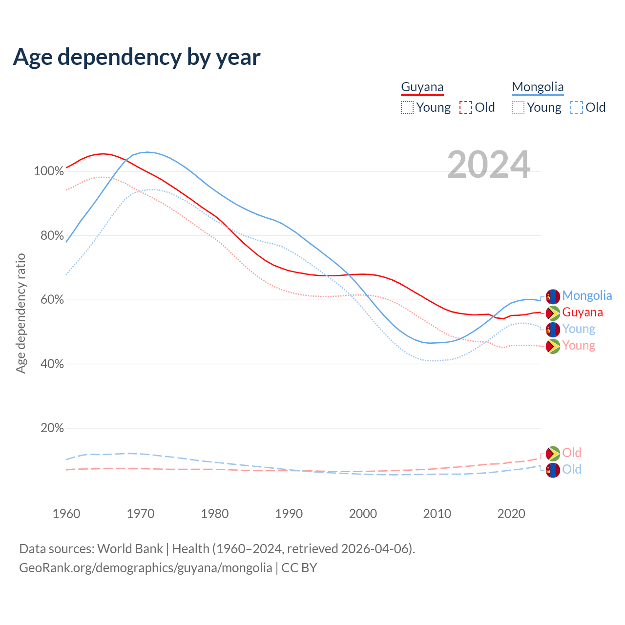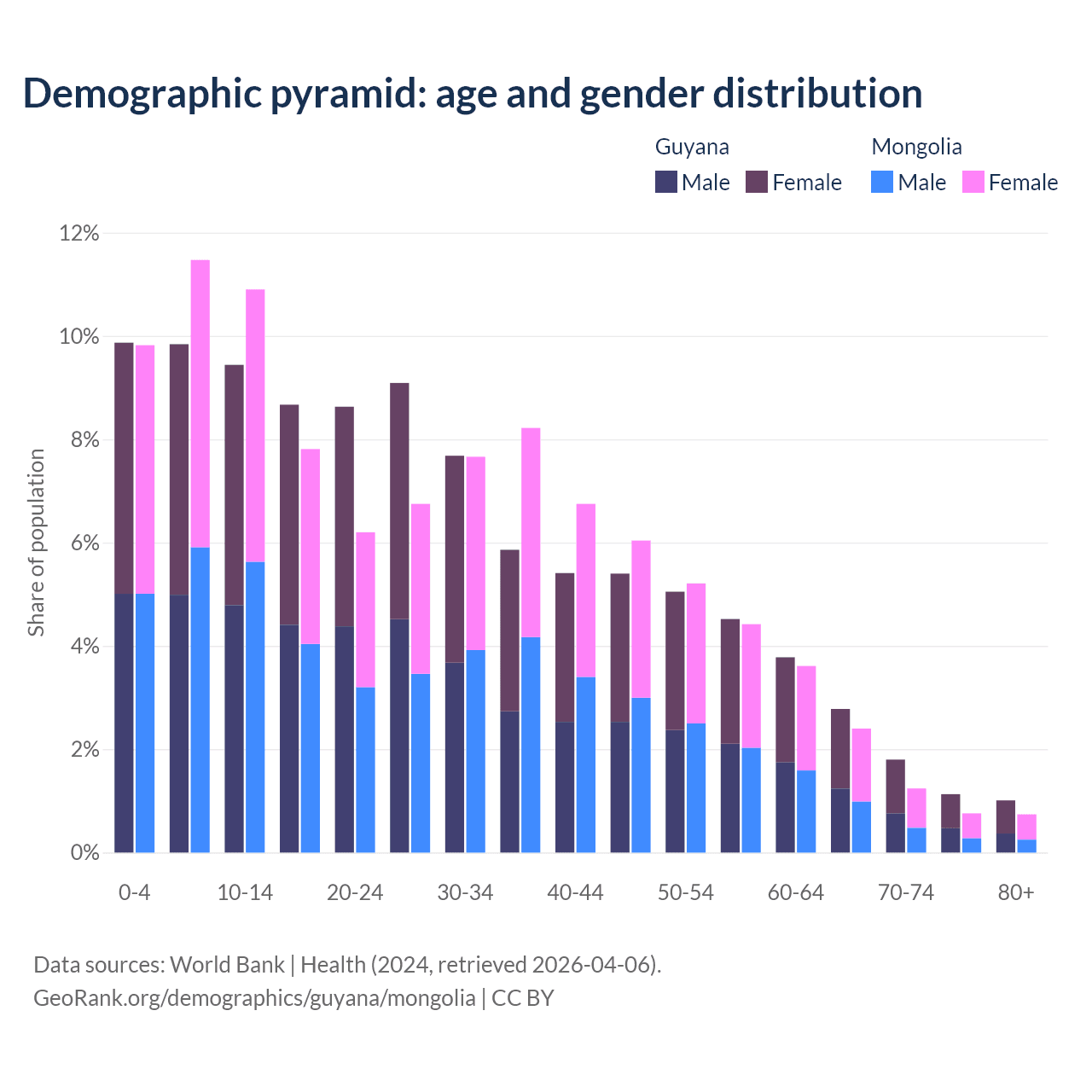 - The share of old-age demographic (65+) in Guyana is 6.73% vs 5.14% in Mongolia.