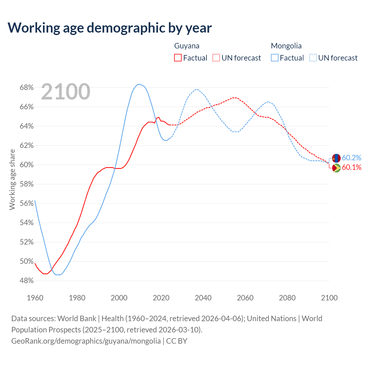 Median age Guyana vs Mongolia, 1960-2100
