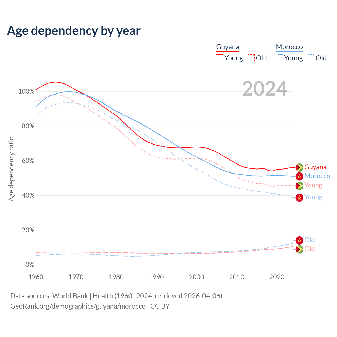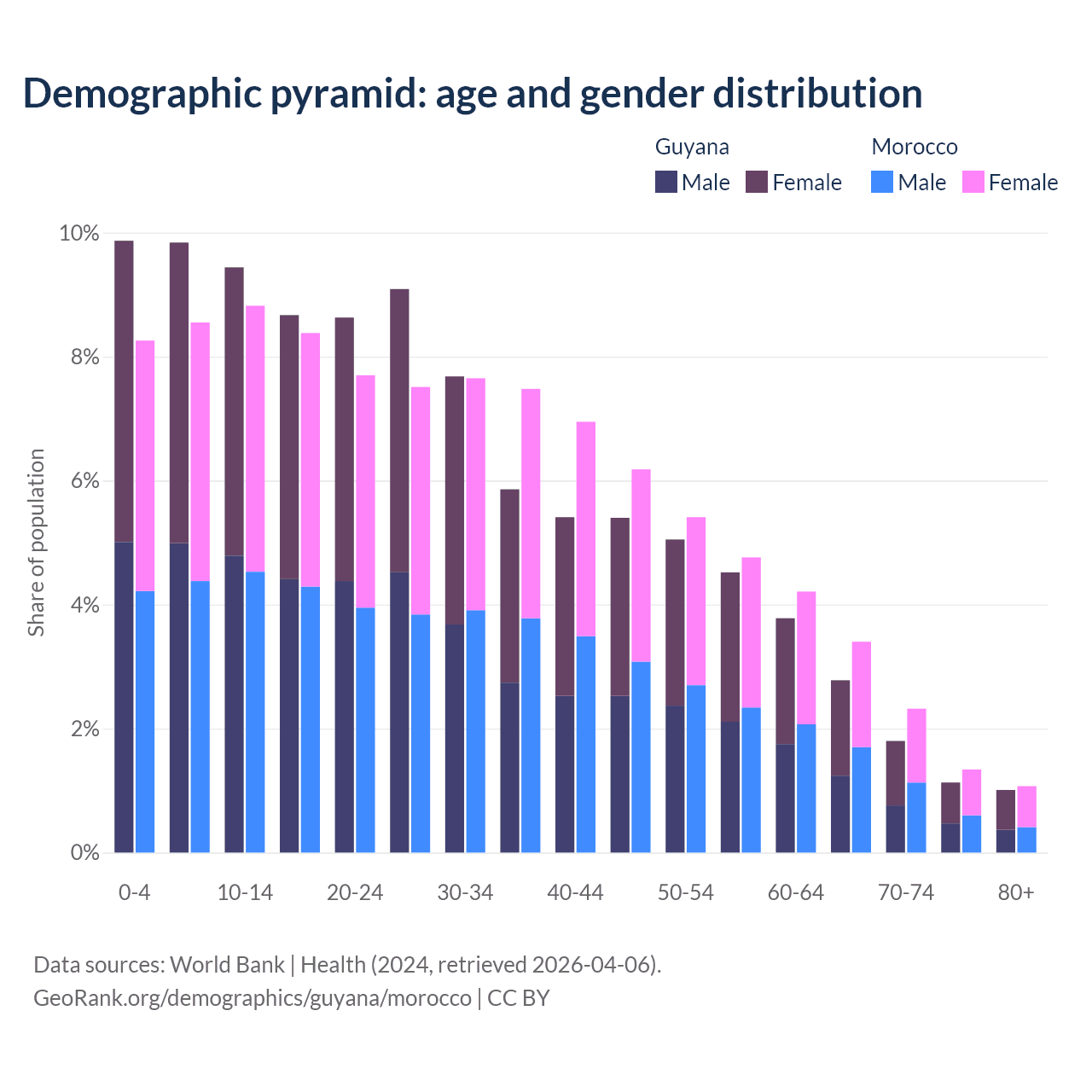 - Guyana is ranked 122/196 by median age (oldest to youngest) vs 100/196 for Morocco.