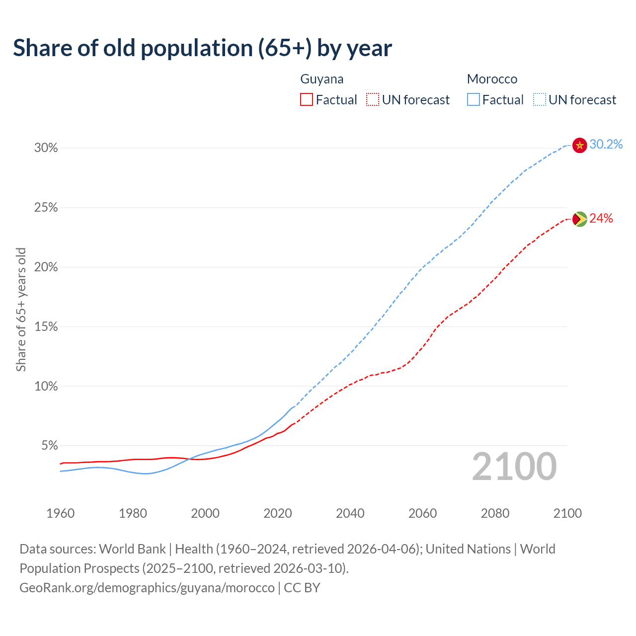 - The share of old-age demographic (65+) in Guyana is 6.73% vs 8.14% in Morocco.