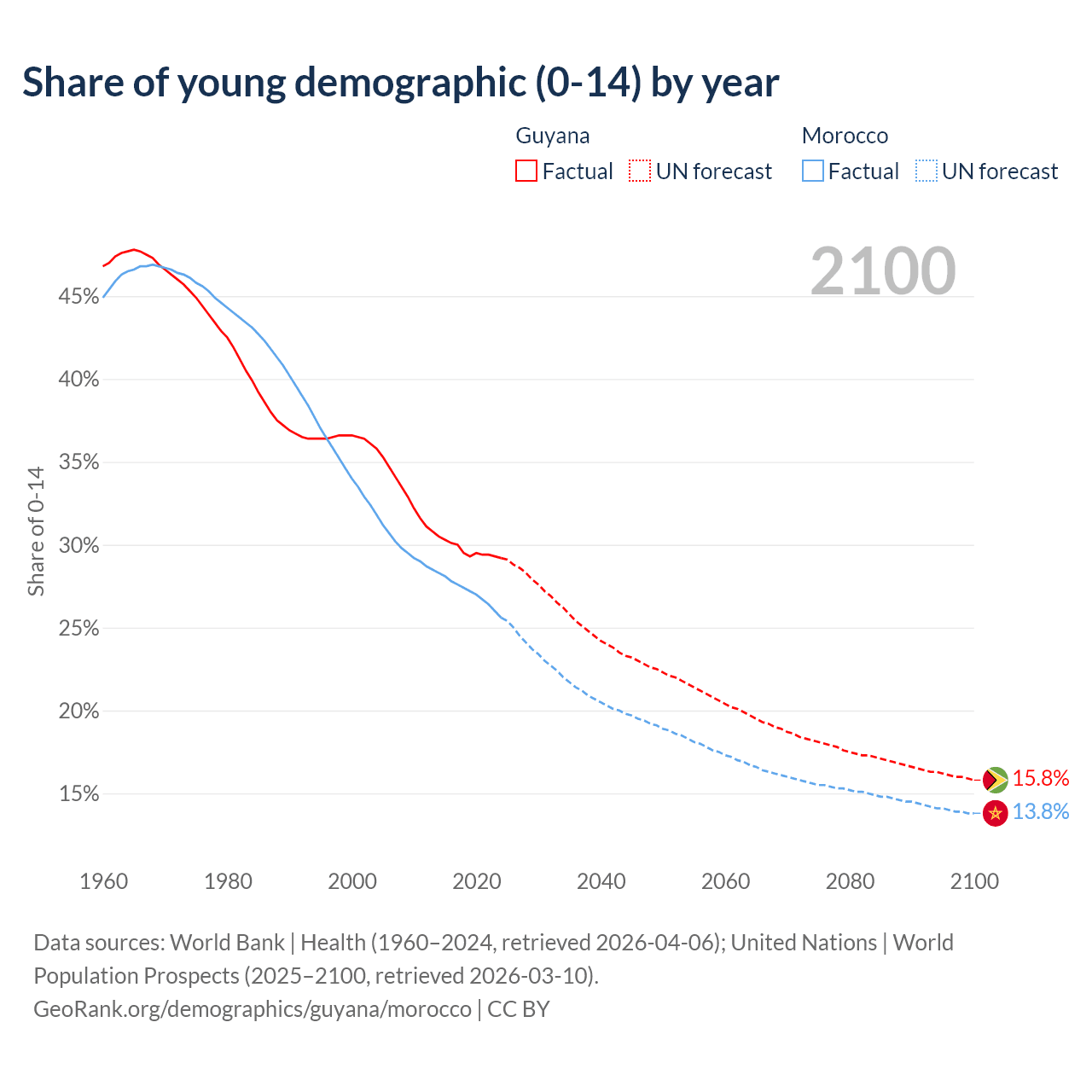 - The share of young demographic (0-15 years old) in Guyana is 29.2% vs 25.6% in Morocco.