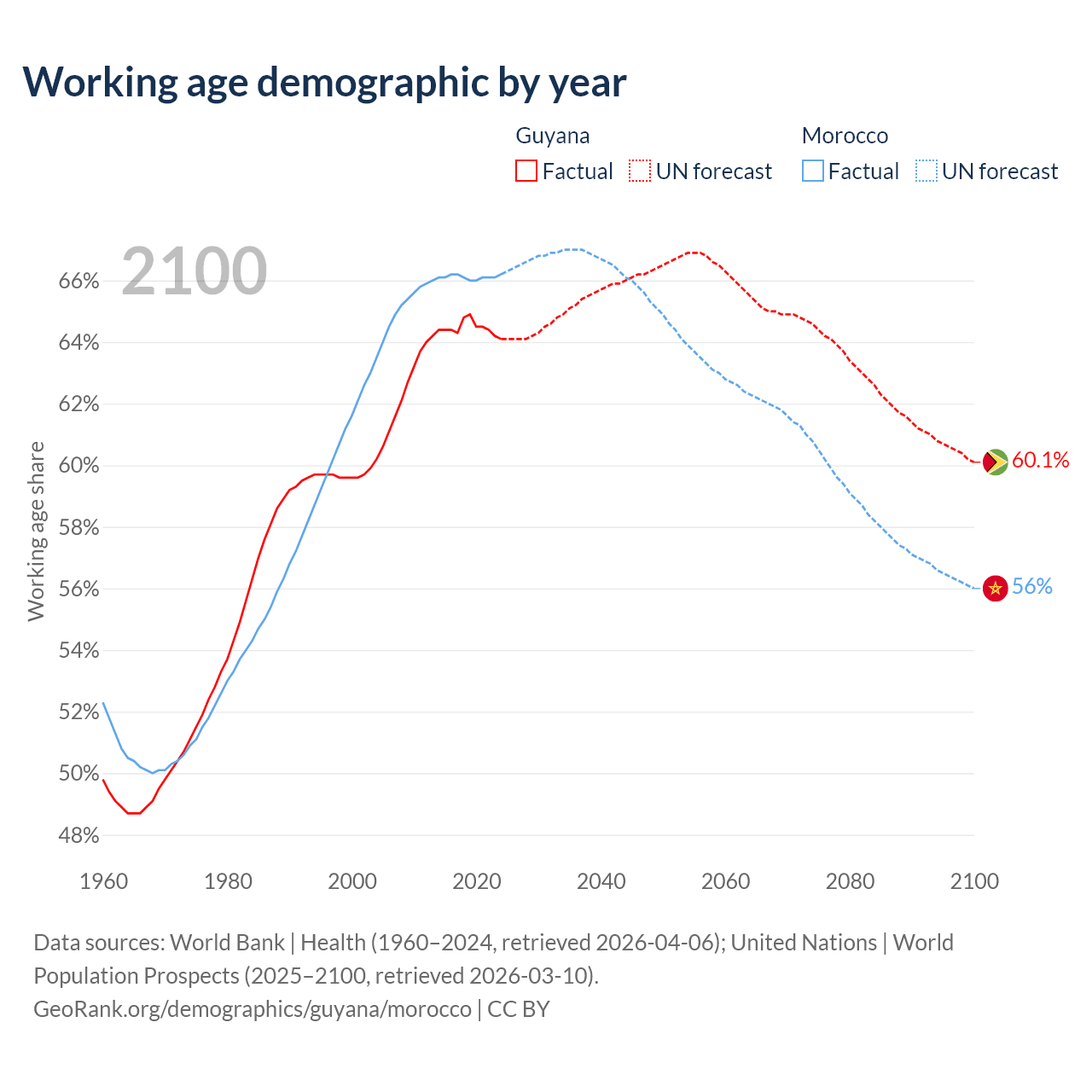 - Guyana has 540K working age adults (aged 15-64) vs 25.7M in Morocco.