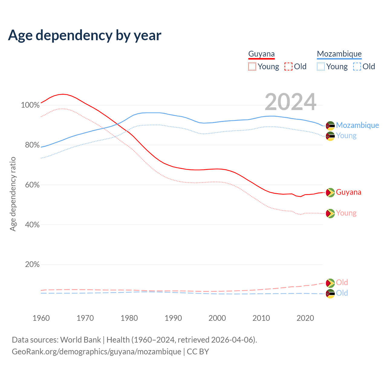 - Guyana is ranked 122/196 by median age (oldest to youngest) vs 189/196 for Mozambique.