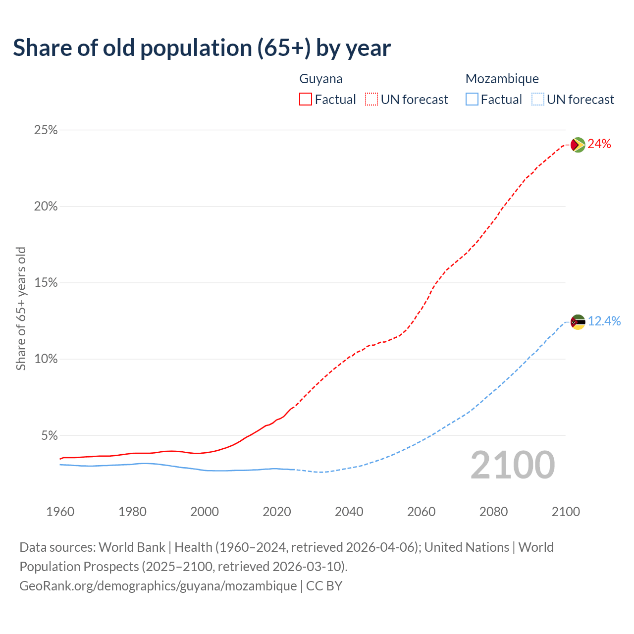 - The share of old-age demographic (65+) in Guyana is 6.73% vs 2.75% in Mozambique.