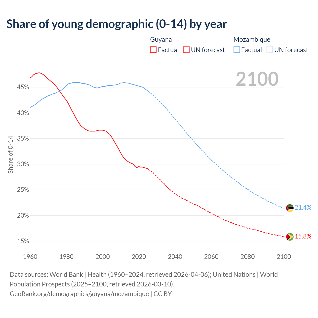 - The share of young demographic (0-15 years old) in Guyana is 29.2% vs 44.5% in Mozambique.