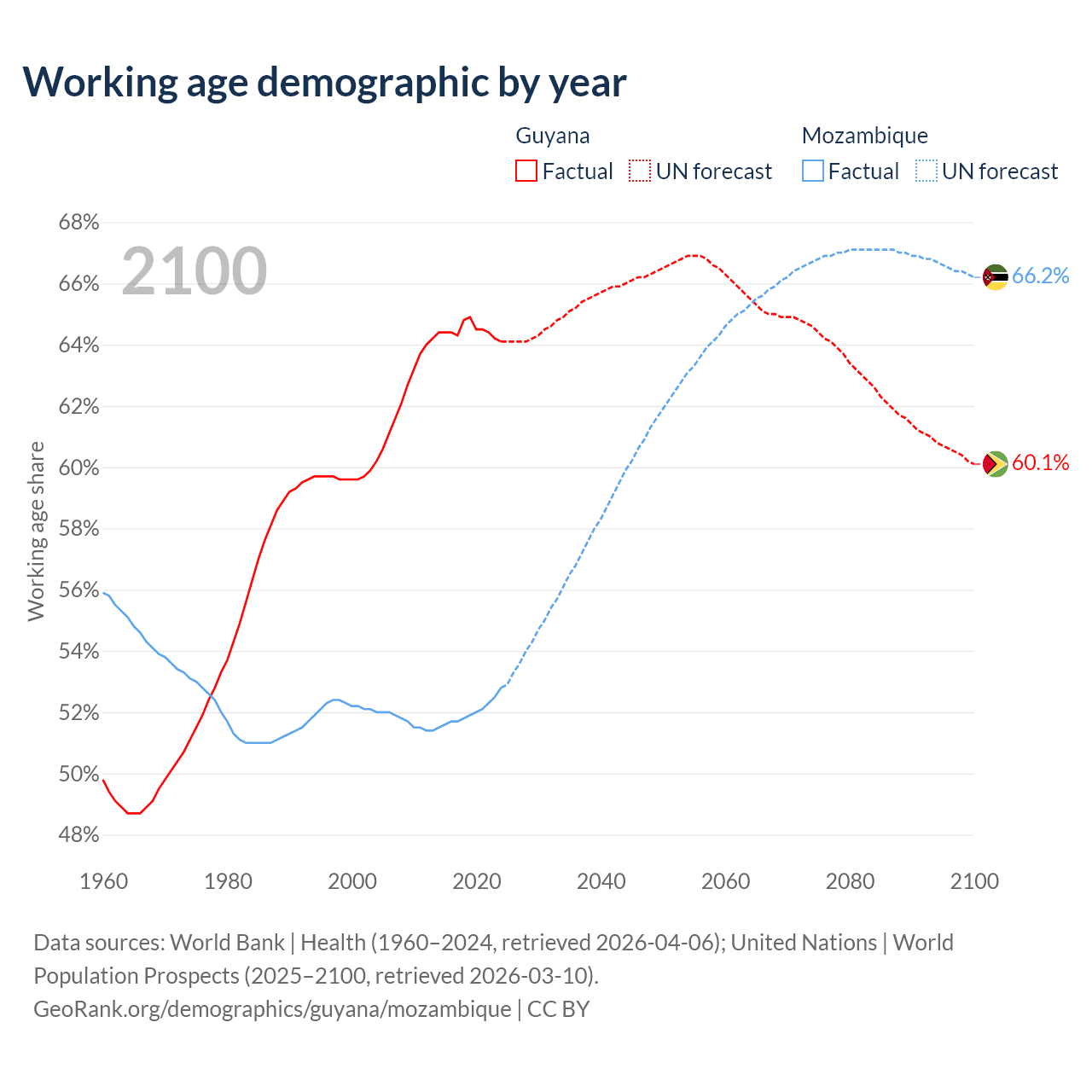 - Guyana has 540K working age adults (aged 15-64) vs 19.5M in Mozambique.
